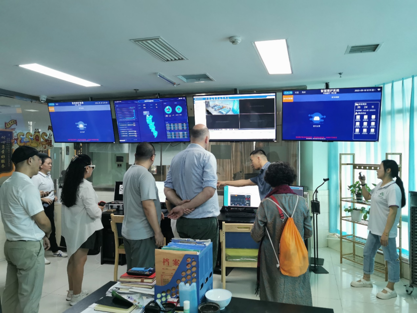 接着,专家组一行来到乔松医养的信息指挥中心,大家看到了让人眼前一亮的全套智能化监护设备,通过深圳我家守护科技有限公司董事长陈伟明先生现场的详细讲解和演示,了解了医生、护士、护理员、家属和管理五个方向的智慧医养云平台让大家知晓信息化系统是如何直接介入到医养工作当中起到事事留痕,随时追溯,包括按键实时录入人机交互体系、全自动生命体征循测体系。保障后台就老人的实时状态、病情变化等并随时能查询每个老人的生命体征、健康信息。为 “远程数字化病房”在最快时间内制定出最佳诊疗方案。领导和专家们异口同声赞叹:“智慧医养,落地实施,卓显成效,未来可期”。