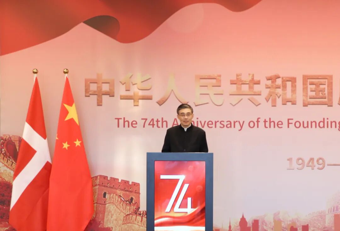 为庆祝中华人民共和国成立74周年,中国驻丹麦使馆在哥本哈根举行招待会。丹麦外交部国务秘书泽玛—琼斯、李思北和丹各界人士,以及部分国家驻丹使节、在丹中资机构、华侨华人和留学生代表300余人出席。