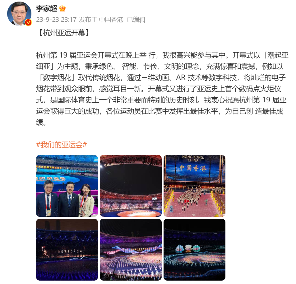 9月23日晚,杭州第19届亚运会开幕式在浙江杭州奥体中心体育场举行。港澳各界纷纷点赞开幕式精彩纷呈,并祝愿杭州亚运会成功举办,港澳运动员们都取得佳绩。