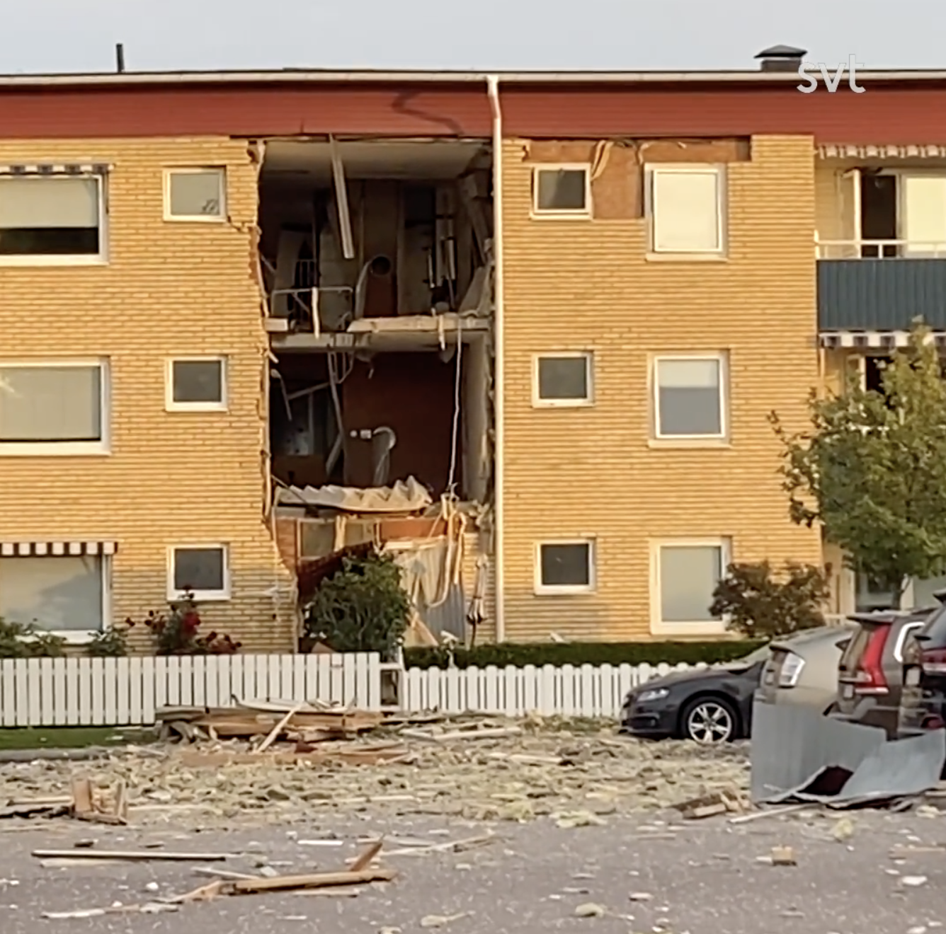 -房子的材料散落一地,我们看到窗户和木板被爆炸后飞出,SVT记者Martin Klevelid在现场说。