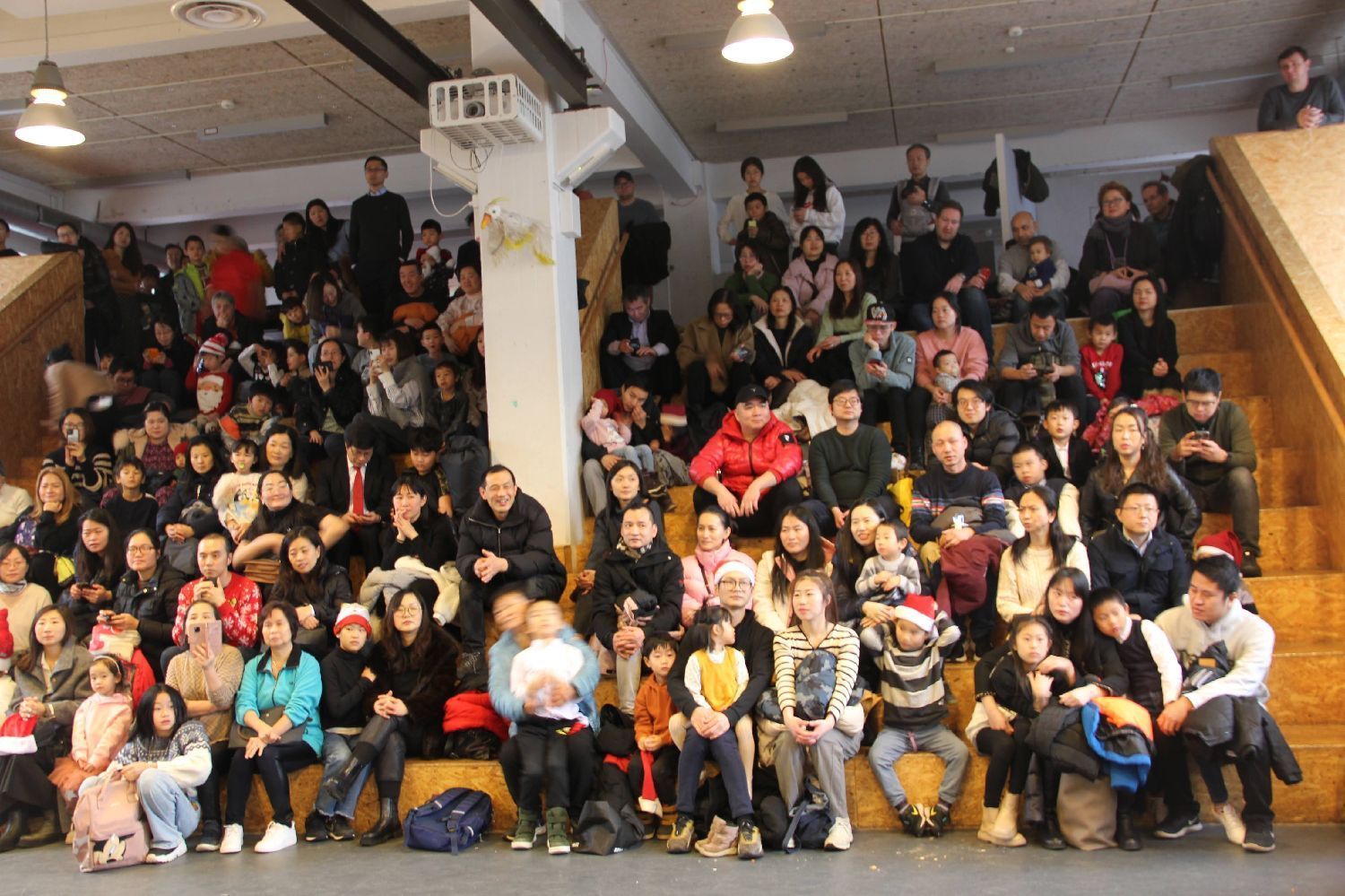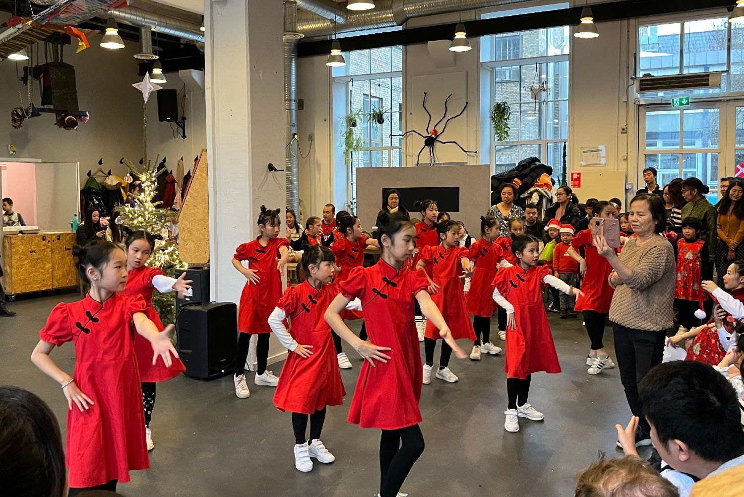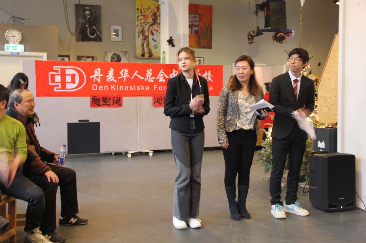 10时许大厅里已挤满了人,老师、学生、家长、丹麦华人总会的主席、副主席、总会常委、丹麦华人总会文化会的会员都来了,大家布置的布置,化妆的化妆,排练的排练,忙得不亦乐乎!在粉妆玉砌、冰封雪盖的日子里,三百多名学生、家长、老师欢聚一堂,这里处处充满着温暖、热闹、喜庆和和谐,不是一家,胜似一家。