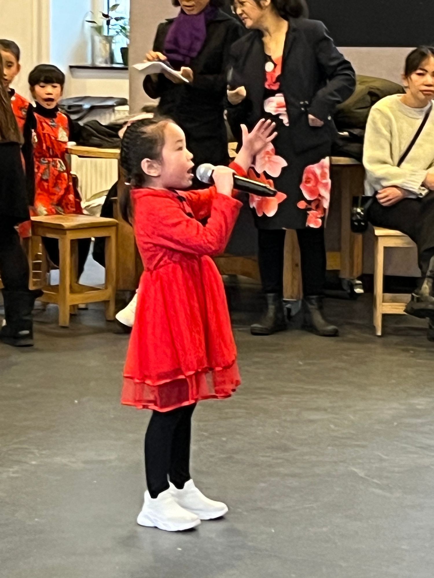 一班、二班的孩子虽然进校才四个月,但他们却能颂读、吟唱儿歌和唐诗。用简单的舞蹈来表达对中文字、词的理解。四岁多的王冠西还能用流利的中文报幕。家长们纷纷举起手机拍照,为这些可爱的孩子们留下了精彩的𣊬间。