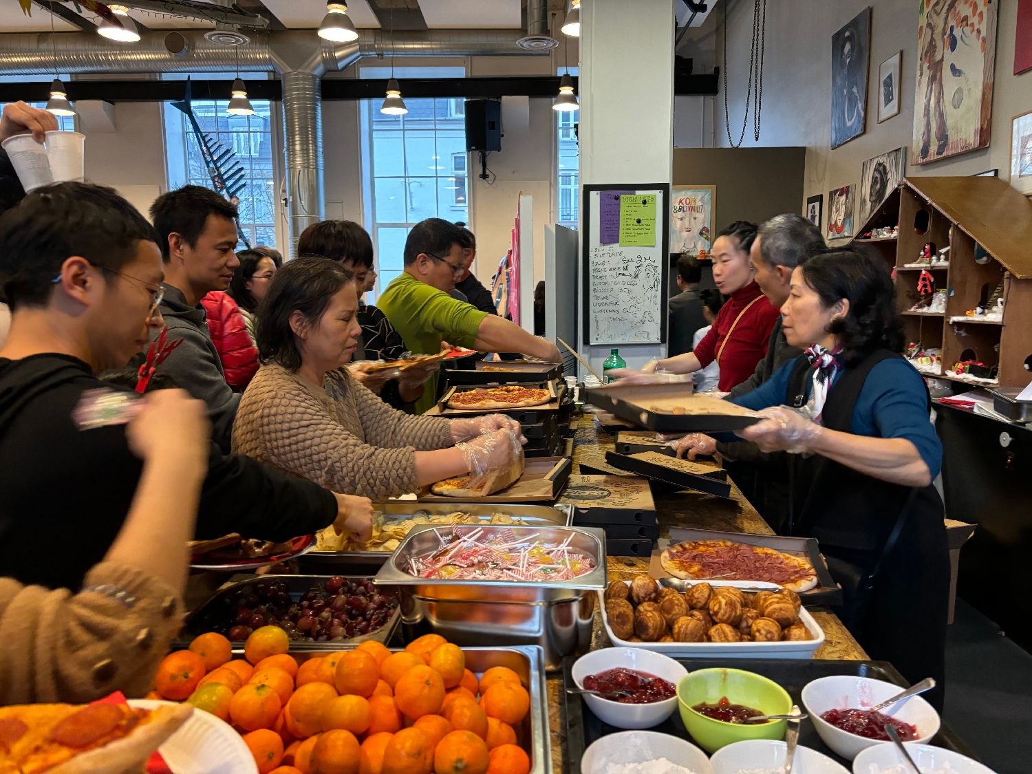 圣诞自助餐开始了,中文学校为大家准备了披萨、薯片、苹果松饼球、水果、汽水。个个笑逐颜开。