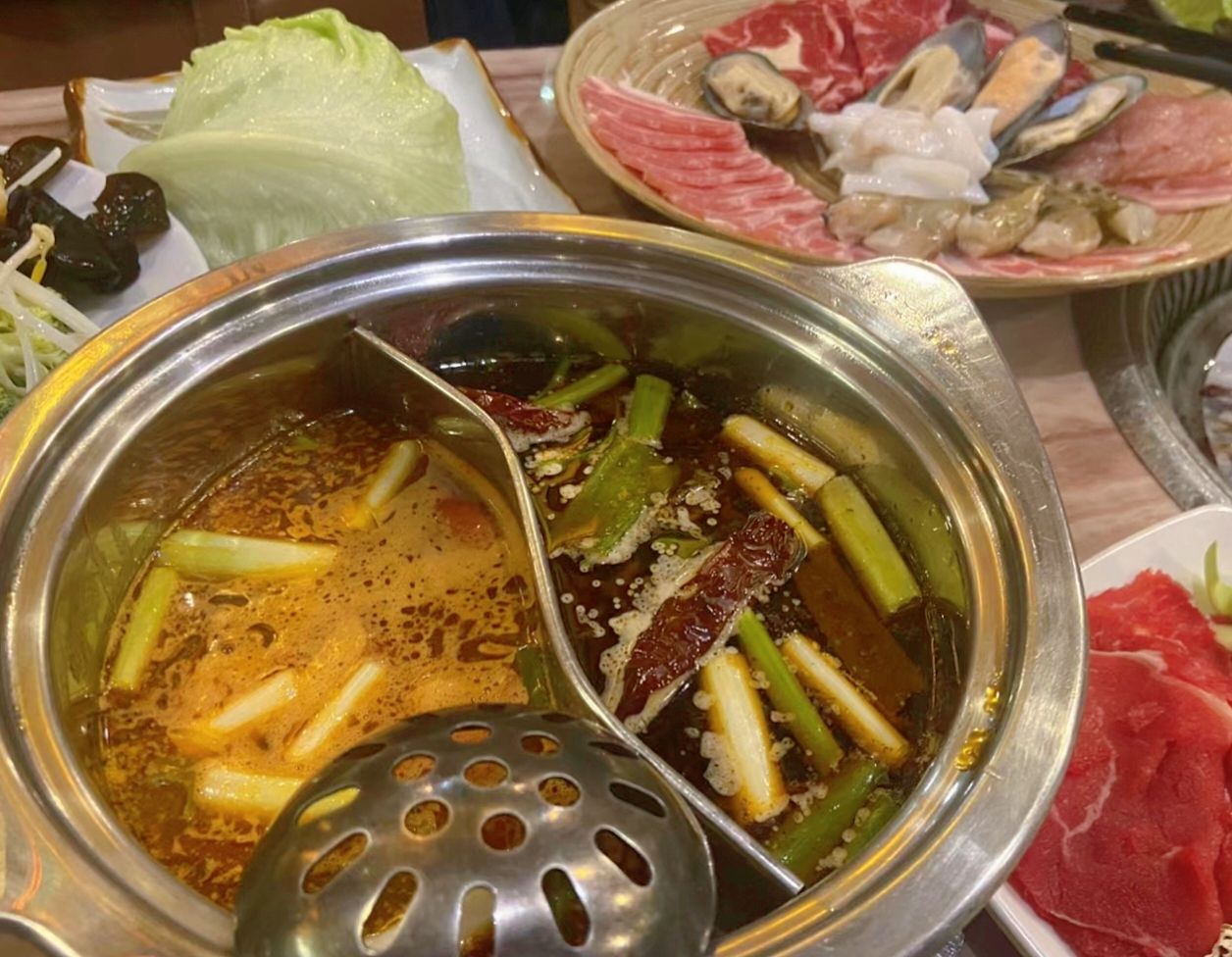 近日,瑞典斯德哥尔摩朝日火锅店的鸳鸯火锅和菜品。(图片来源:受访者供中新社图)