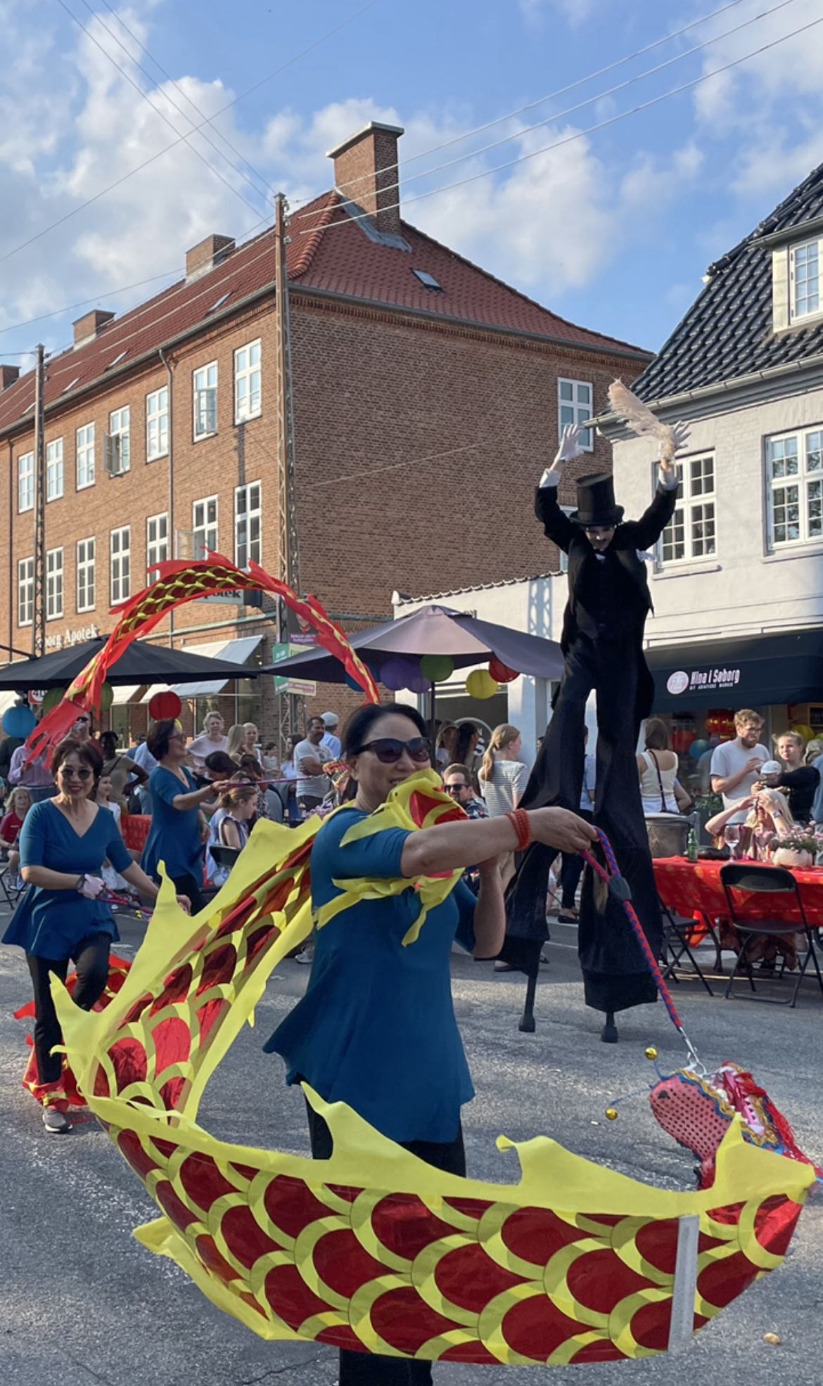 下午五时许,艺术团的队员们敲着鼓,打着镲,浩浩荡荡地来到Søborg Hovedgade,今年走在队伍前面的与以往不同,是四条红色与金色的龙,因为今年是中国的龙年,理所当然以龙为主题,四条游龙随着鼓点翩翩起舞,游入了主街道。时而龙头冲向蓝天,时而头尾相接成为一个圆形,时而与旁边的小丑嬉戏,时而与踩着高跷的安徒生打情斗趣,时而与街头的小丑斗笑,时而与观众中的孩子一起玩耍……充满情趣。