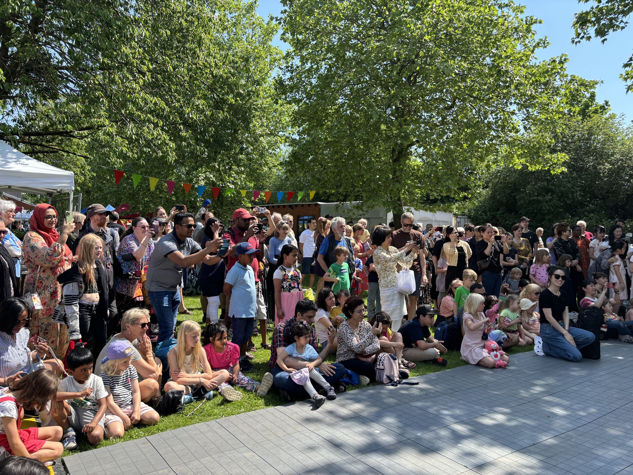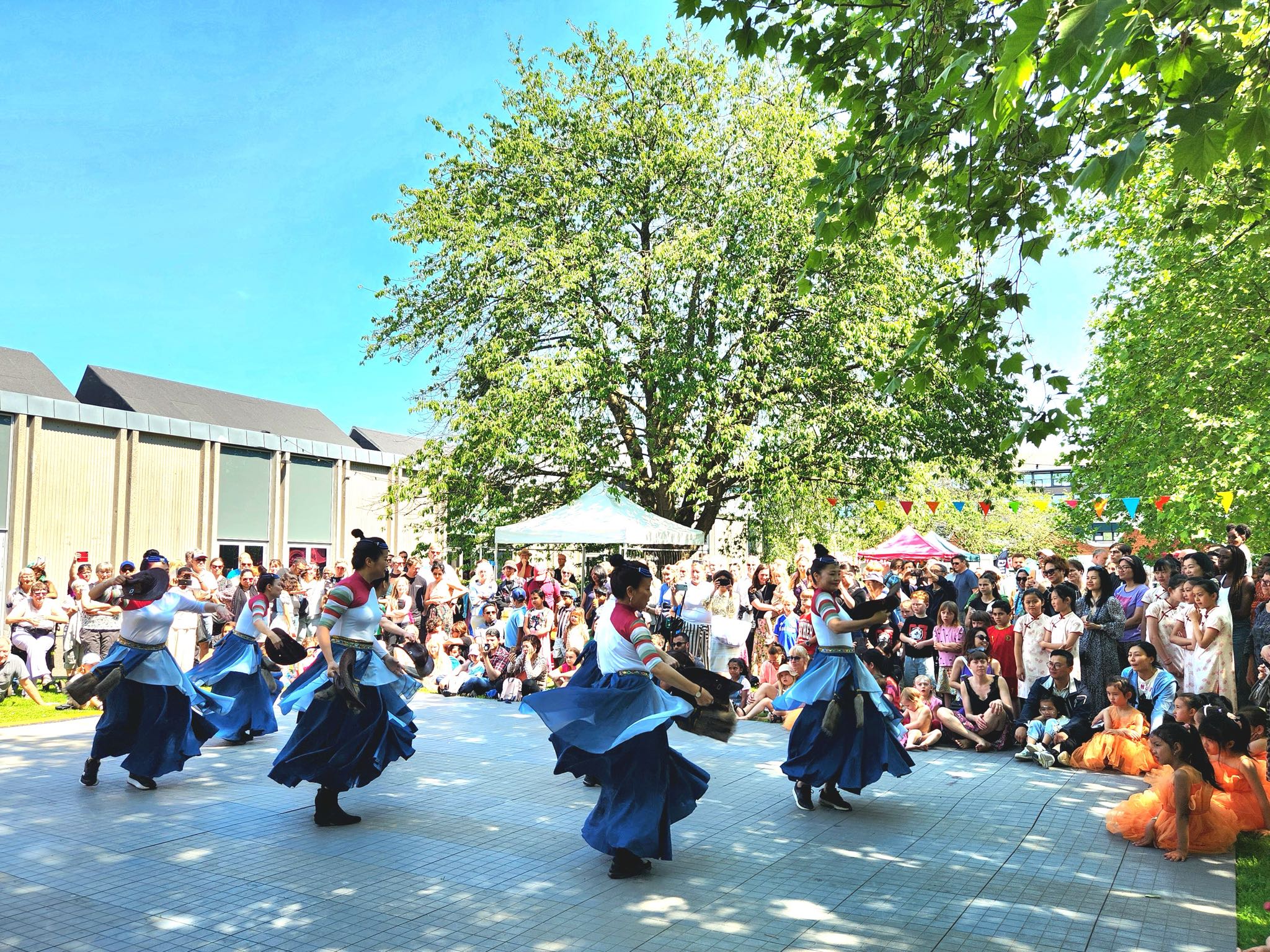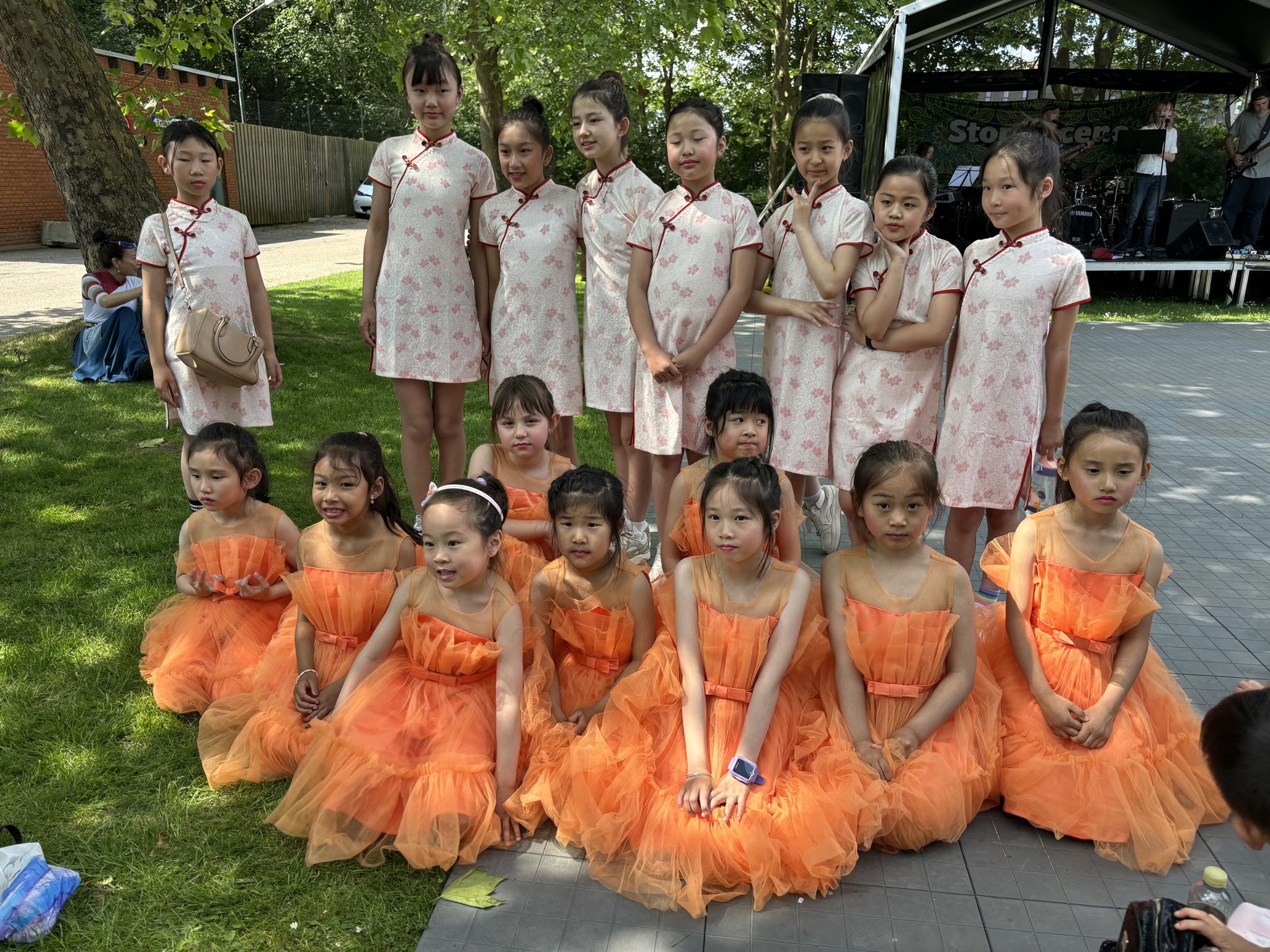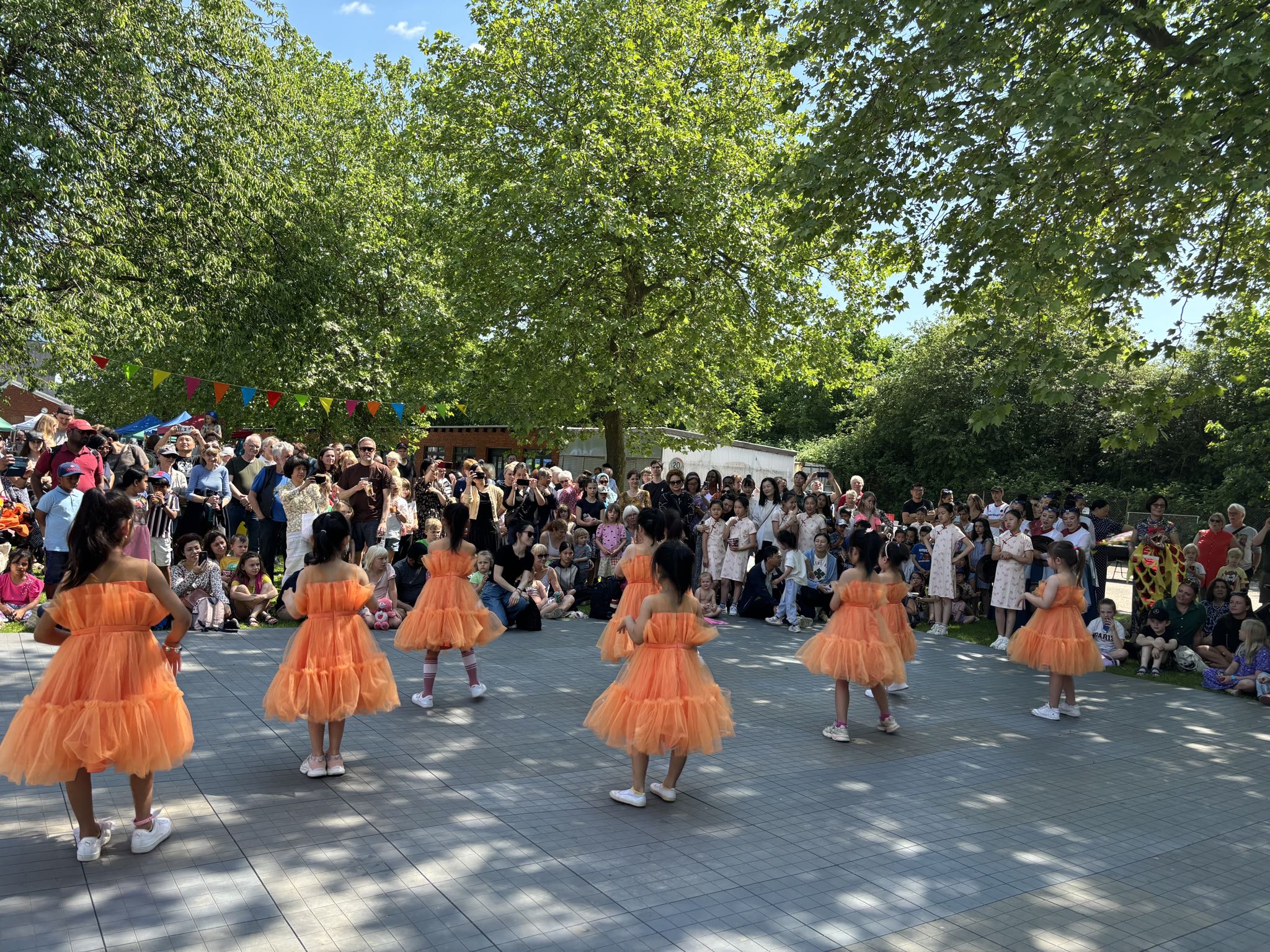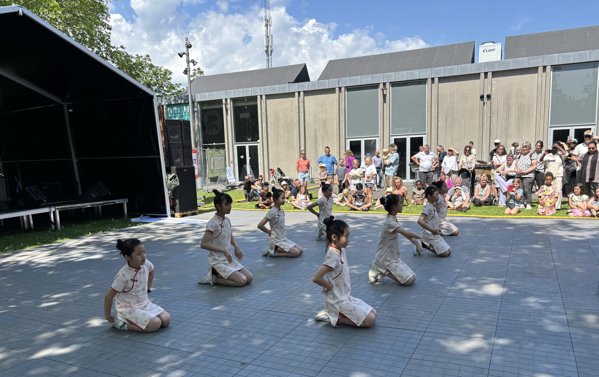 13:00我们的演出闪亮登场,舞蹈还没开始,观众席的草坪上已坐满了人,男女老少、里三层外三层,好不热闹。丹麦华人总会少儿艺术团团员表演的第一个舞蹈是“我要变可爱”,在轻松愉快的音乐声中,孩子们跳出了童真、童趣、童爱,展示了幸福快乐的童年生活。