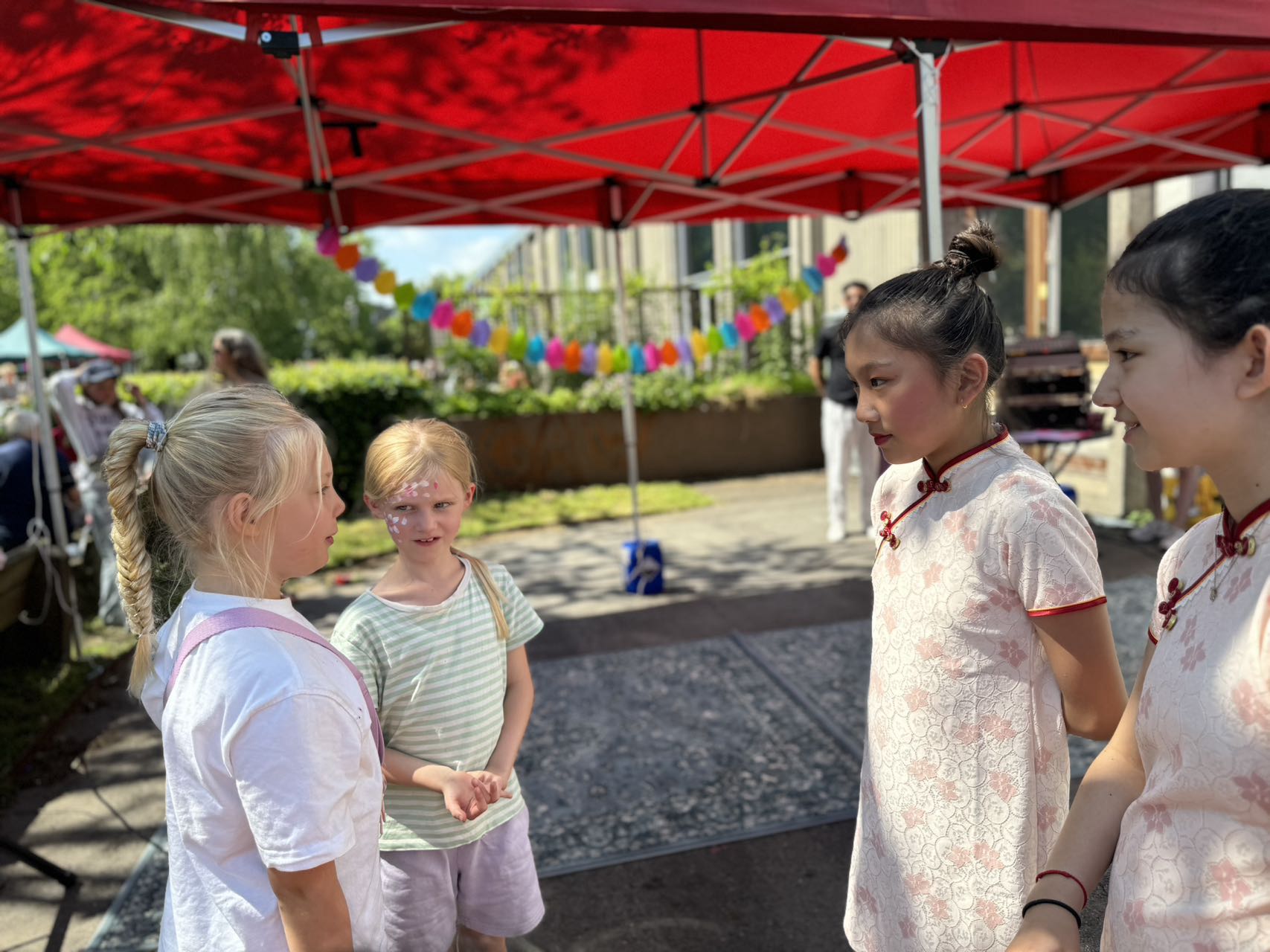 当孩子们来到国际文化日的中心广场,这儿已热闹非凡,绿草如茵的广场上已摆满了具有各国风味的摊位,散发着各国食品的气息,孩子们立刻像小鸟似地飞到了那儿。大孩子的粉色旗袍、小孩子的橙色公主裙,立刻吸引了不少粉丝,孩子们走到哪里,各国孩子也跟到哪里,无形之中中国孩子成了中心。