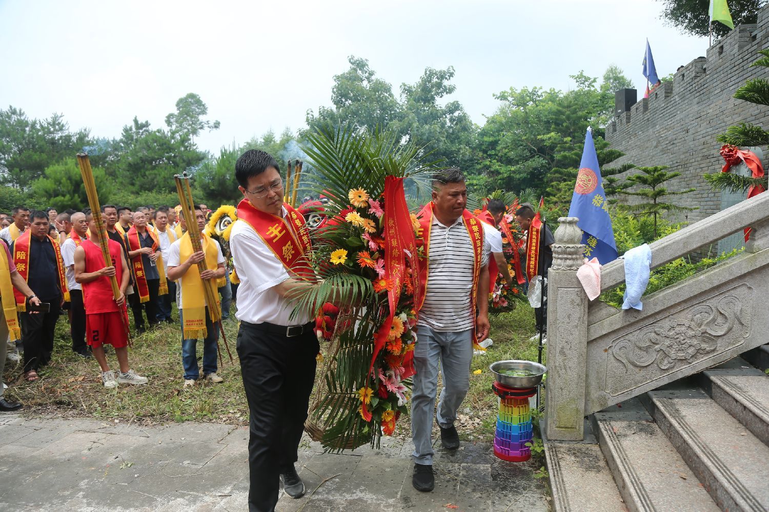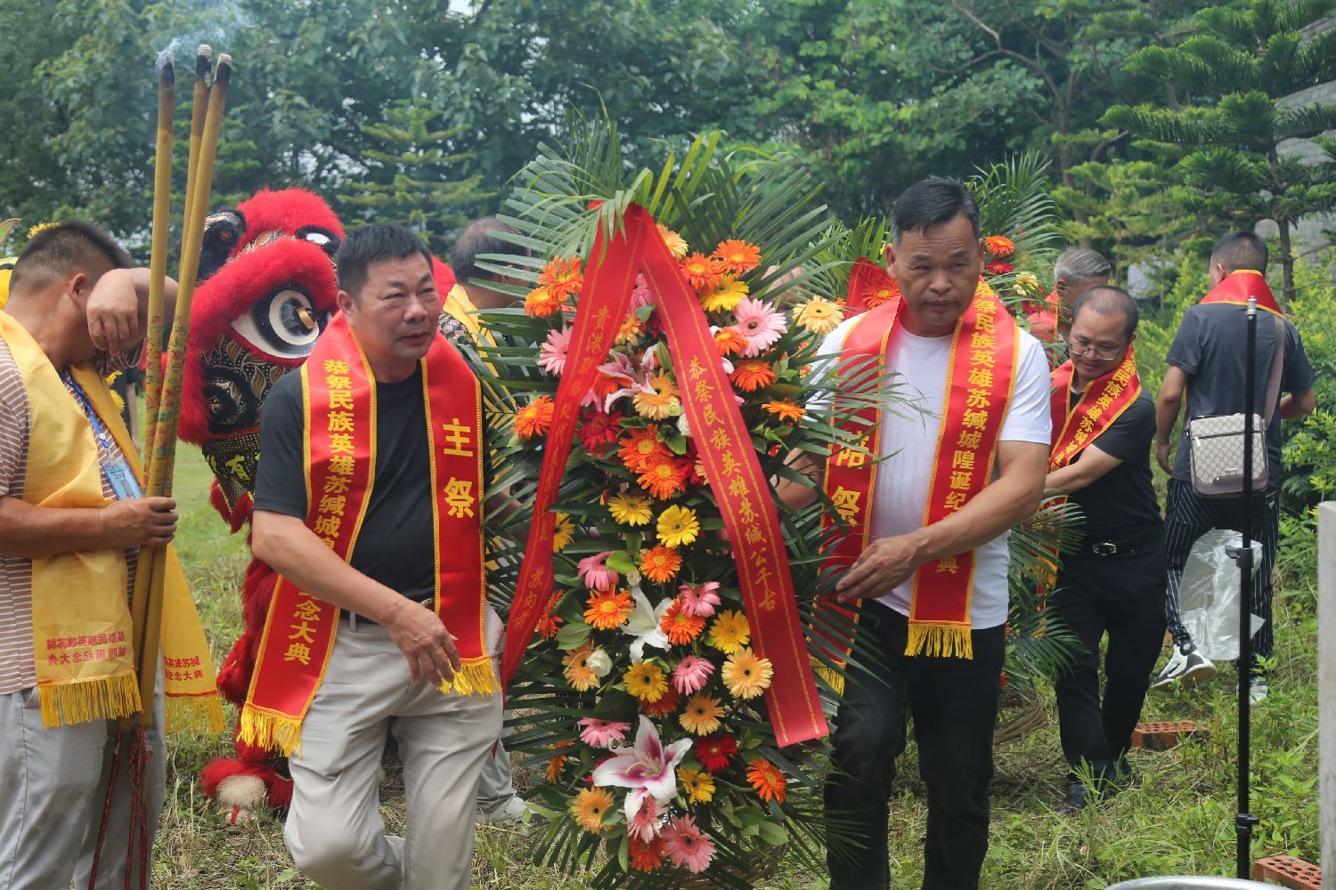 上午11时30分,南宁龙门水都苏缄广场,彩旗飘扬,龙狮欢腾,鸣锣三响,击鼓三通,苏立孟诵读祭文完毕。广西苏缄文化研究会主任苏受吉和副会长苏善奋、苏忠人率参加恭祭人员向民族英雄苏缄敬献花圈,行三鞠躬礼,参加恭祭的苏缄后裔、区内外各地苏氏宗亲、应邀嘉宾依次上前上香敬酒、叩拜,瞻仰苏缄雕像。现场还举行诗歌朗诵和精彩的文艺演出。人们沉浸在典雅庄重的仪式中追怀苏缄,学习弘扬苏缄忠贞报国精神。