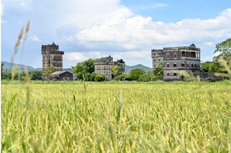 7月17日,广东开平自力村内的稻田与四周碉楼相映成趣。(图片来源:本文图片均据中新社)