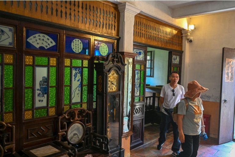 走进铭石楼,仿佛穿越到楼主人居住的年代。入口处的德国钢板门窗已经锈迹斑斑,客厅摆放着从意大利进口的玻璃屏风。房间内有多个华侨回乡时专门用来装贵重物品的“金山箱”,箱子的大小和数量是华侨身份和财富的象征。
