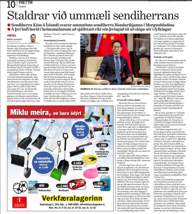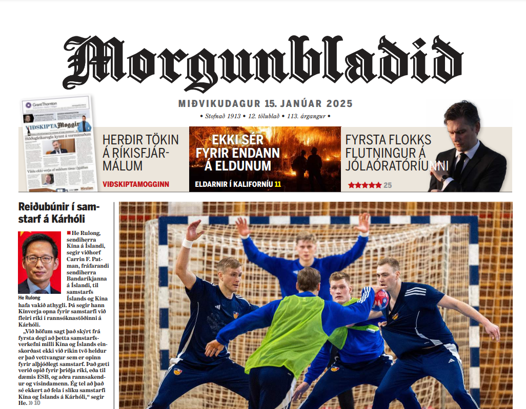 2025年1月15日,冰岛《晨报》(Morgunblaðið)报纸和网站在头版头条刊登对何儒龙大使专访,驳斥有关涉华负面言论,宣介我构建人类命运共同体理念。