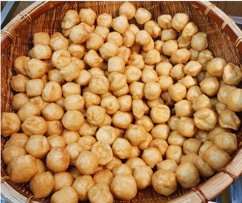 覃菊还称,信宜的豆炸要数双乐村的最为出名,不仅富含人体所需的多种营养物质,而且外韧里松,香气浓郁,具有独特的地方风味。双乐村的豆炸有球形状,也有条形状,当地村民称球形状的为“黄金果”,称条形状的为“黄金条”,寓意美好,因而豆炸成了大成镇各种喜宴不可缺少的菜肴。喜宴结束后,主人家通常会让宾客带两袋豆炸回去和家人品尝,分享喜悦。
