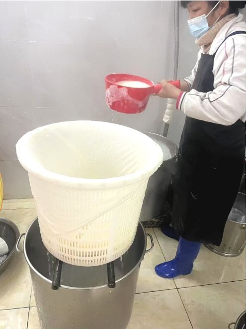 1月11日,豆炸食品厂工人过滤用来制作豆炸的豆浆。