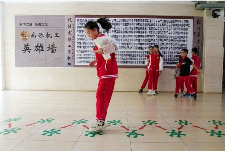 6月23日,昆明市西山区侨光小学课间休息时,学生在教室外活动,身后是学校制作的南侨机工英雄墙。(图片来源:本文图片均据中新社)