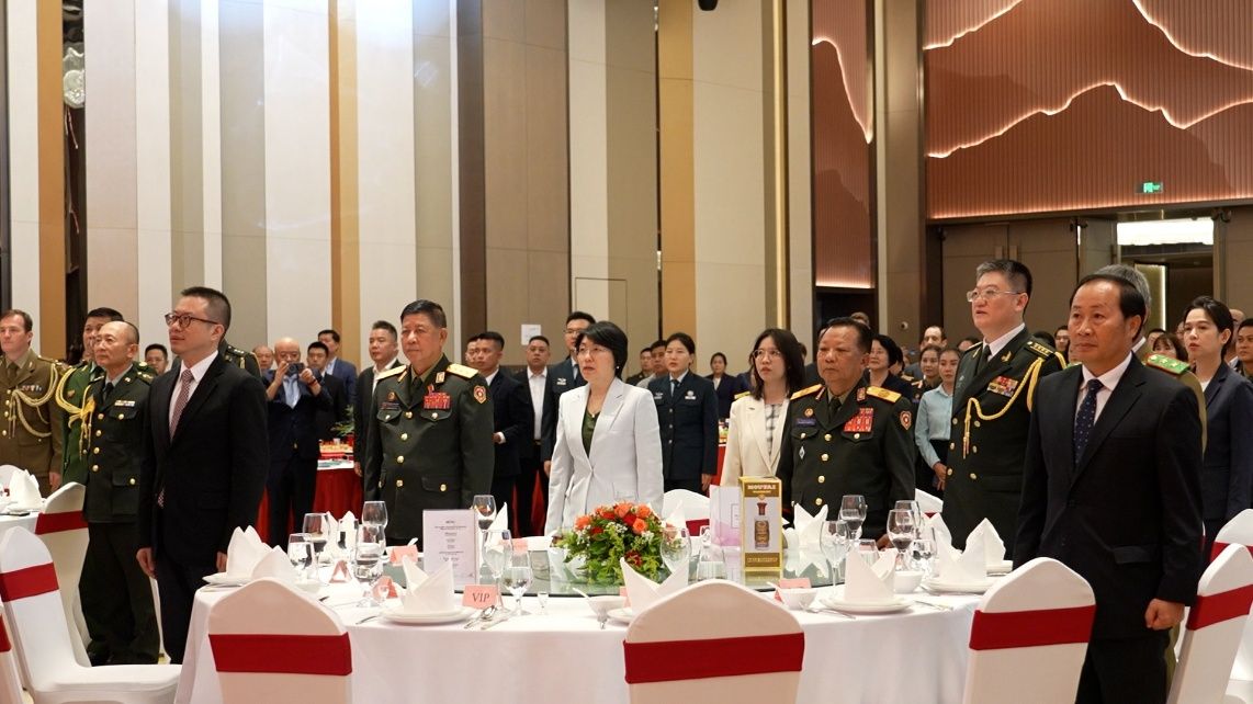 招待会现场展播了中国军队宣传片和纪念中国人民抗日战争暨世界反法西斯战争胜利80周年图片。