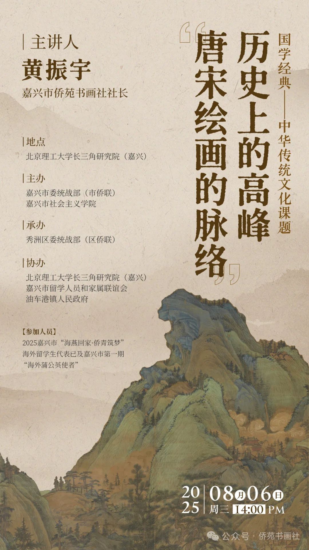 嘉兴银杏天鹅湖飞鸟集度假村内,湖光潋滟。8月6日,一场聚焦于唐宋绘画辉煌脉络的文化课题在此开启。主讲人黄振宇引领听众直抵中国古典绘画走向鼎盛的核心。在嘉兴市委统战部与嘉兴市社会主义学院的精心组织下,这段丹青史诗徐徐展开。