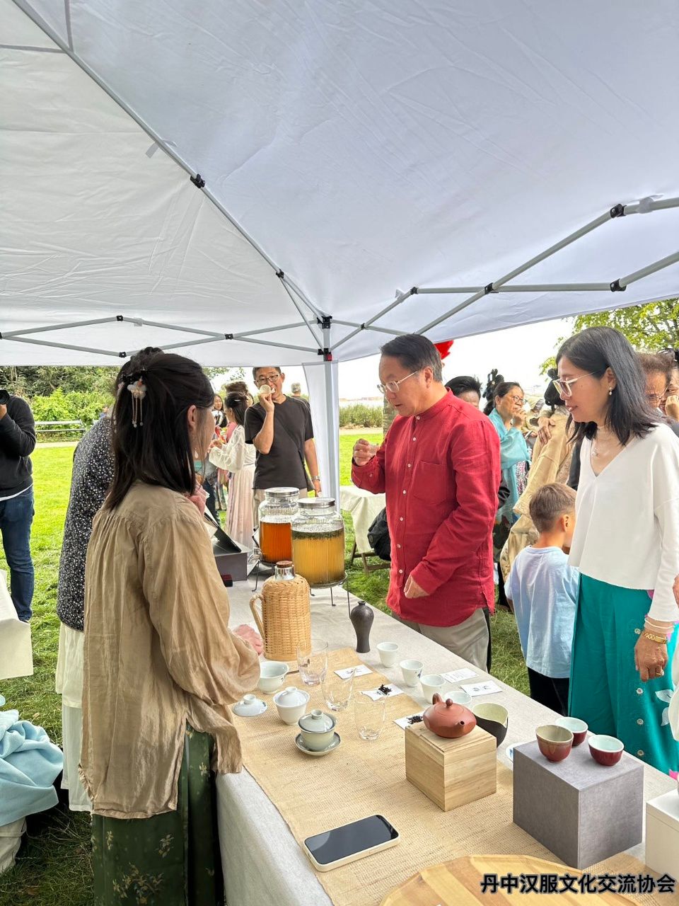 茶艺:茶席一侧,侯泽铭女士身穿宋制汉服,动作安静而从容。三款乌龙茶依次奉上,茶香在风中散开,入口清甜,与汉服的古雅相映成趣。