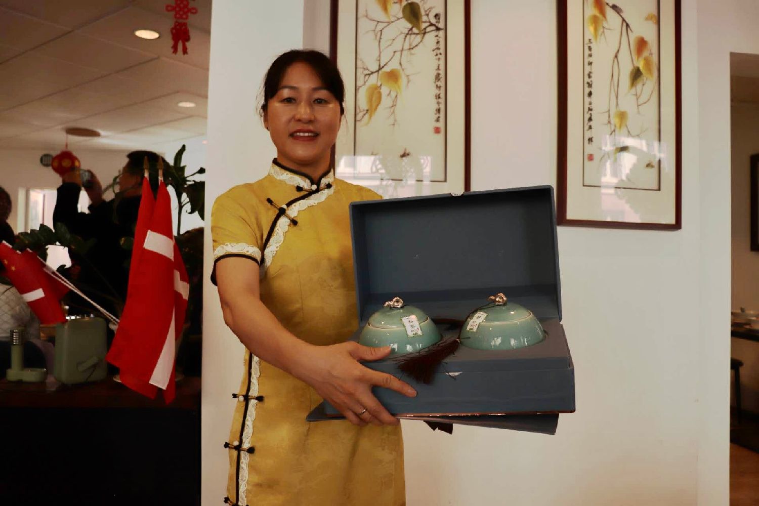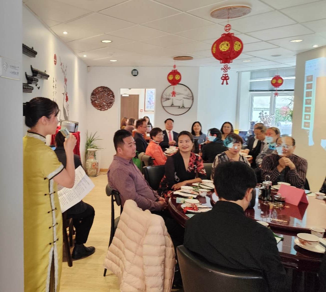 中国驻丹麦大使馆王雪峰大使及夫人童新教授、中国驻丹麦大使馆沈昂主任、哥本哈根中国文化中心慕享宏主任、丹麦华人总会主席林燕标先生、哥本哈根市议员海迪·Wang女士、丹麦爱心家园会长杨慕君女士、丹麦华人总会首席副主席柯本佑先生、丹麦和平统一促进会会长叶利宗先生、丹麦高级法律顾问鄢爱华女士、丹麦华人总会文化会会长、中文学校副校长俞露女士、丹中餐饮协会会长林洲先生、丹麦海南同乡会会长符福全先生、丹麦安徽同乡会顾问魏德林先生、丹中友协会会长,赵温华先生、丹麦移民法集团,法律顾问Wendy,姚起女士、丹麦山东同乡会会长,凌小雨女士、哥本哈根华文协会副会长杨海妍女士、丹麦工程科技大学高级研究员冯驹先生、丹麦工程技术大学研究员,王亚洲先生、准备参选丹麦灵比社区议员官欣炜女士、丹麦福建同乡会副会长马丁先生等等以及来自丹麦各地的乡亲、华侨华人及中丹友好人士七十多位嘉宾欢聚一堂,共庆中秋、共叙乡情。