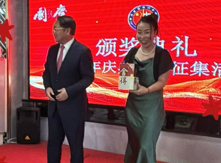 最后是“十周年主题征集颁奖典礼”,郑小燕荣获大奖,获得“舍得”白酒一瓶,王雪峰大使亲自为她颁奖。