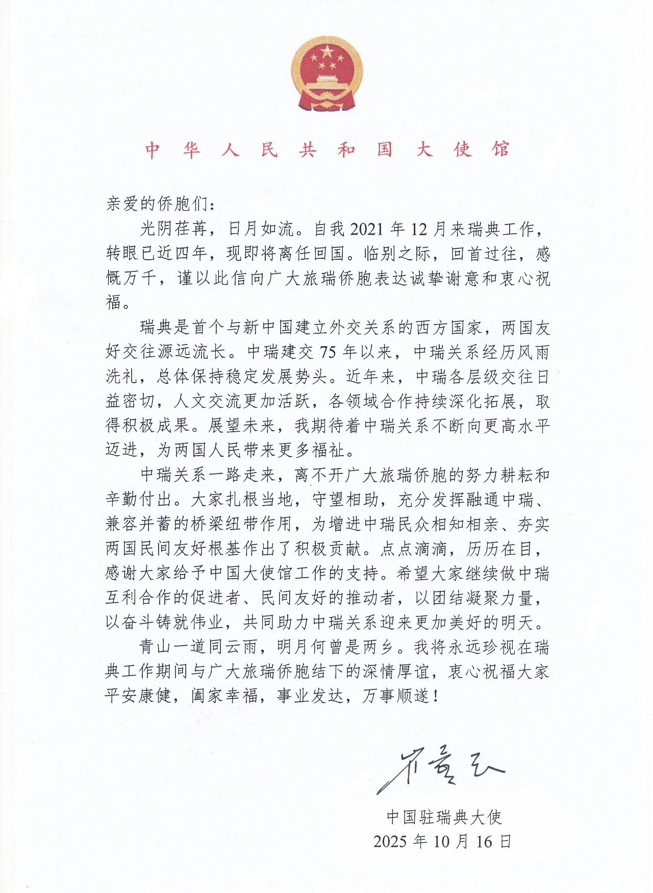 光阴荏苒,日月如流。自我2021年12月来瑞典工作,转眼已近四年,现即将离任回国。临别之际,回首过往,感慨万千,谨以此信向广大旅瑞侨胞表达诚挚谢意和衷心祝福。