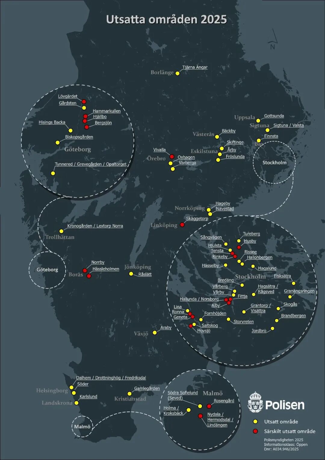 近日,瑞典国家警察局发布新版“治安脆弱地区”名单,将瑞典境内65个地区划定为“治安脆弱地区”,包括斯德哥尔摩、哥德堡、乌普萨拉、马尔默、林雪平、厄勒布鲁、韦斯特罗斯、埃斯基尔斯蒂纳、赫尔辛堡、北雪平等多个城市,具体如下图所示(黄色为“治安脆弱地区”,红色为“特别脆弱地区”)。