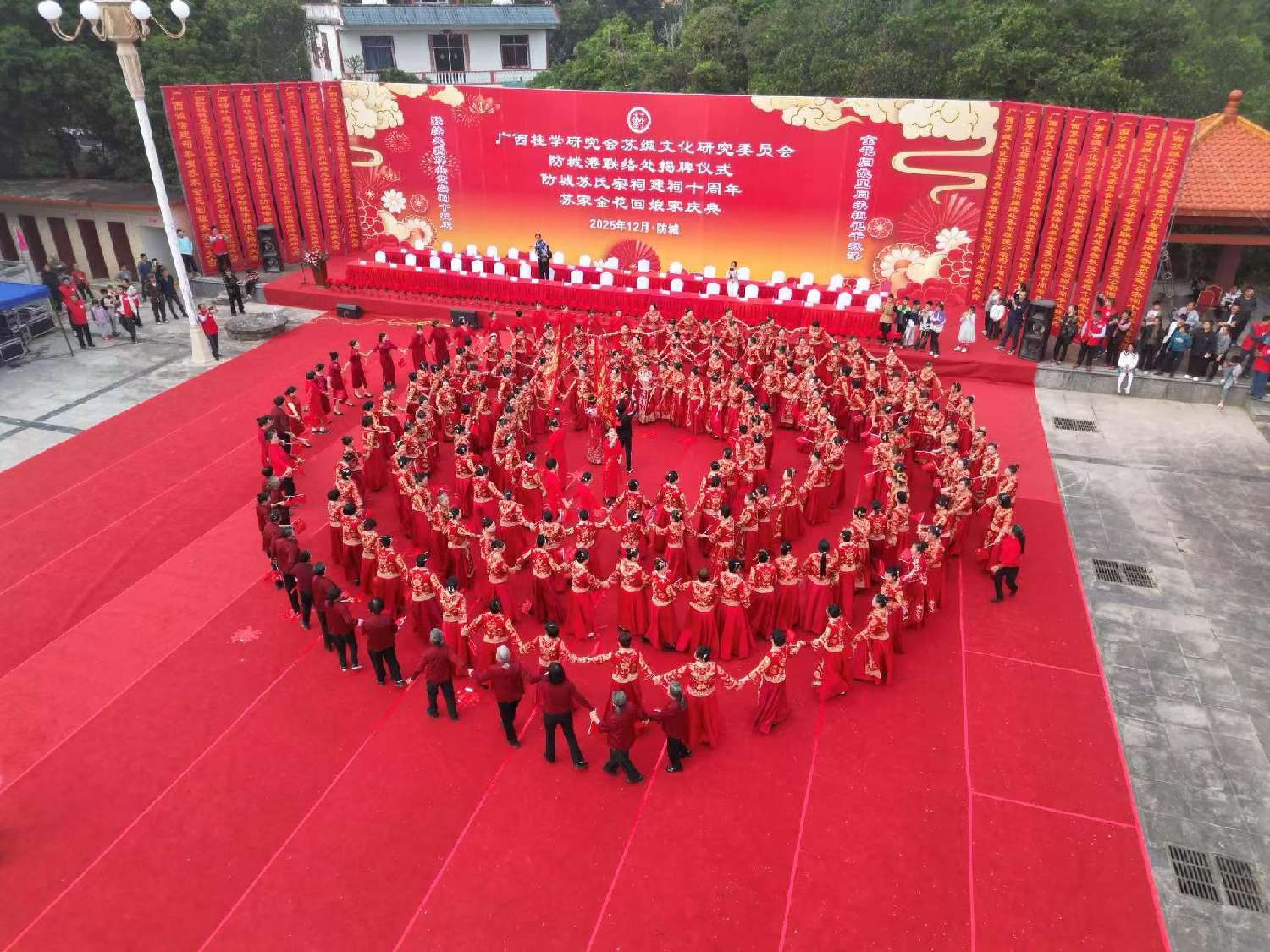 百余名身着绣金传统礼服的苏氏女性,在鼓乐声中环绕祠堂广场,跳起象征生命延续与圆满的“圈圈舞”。旋转的,不只是舞步,是家族的故事,是女性在家族文明中不可替代的角色。