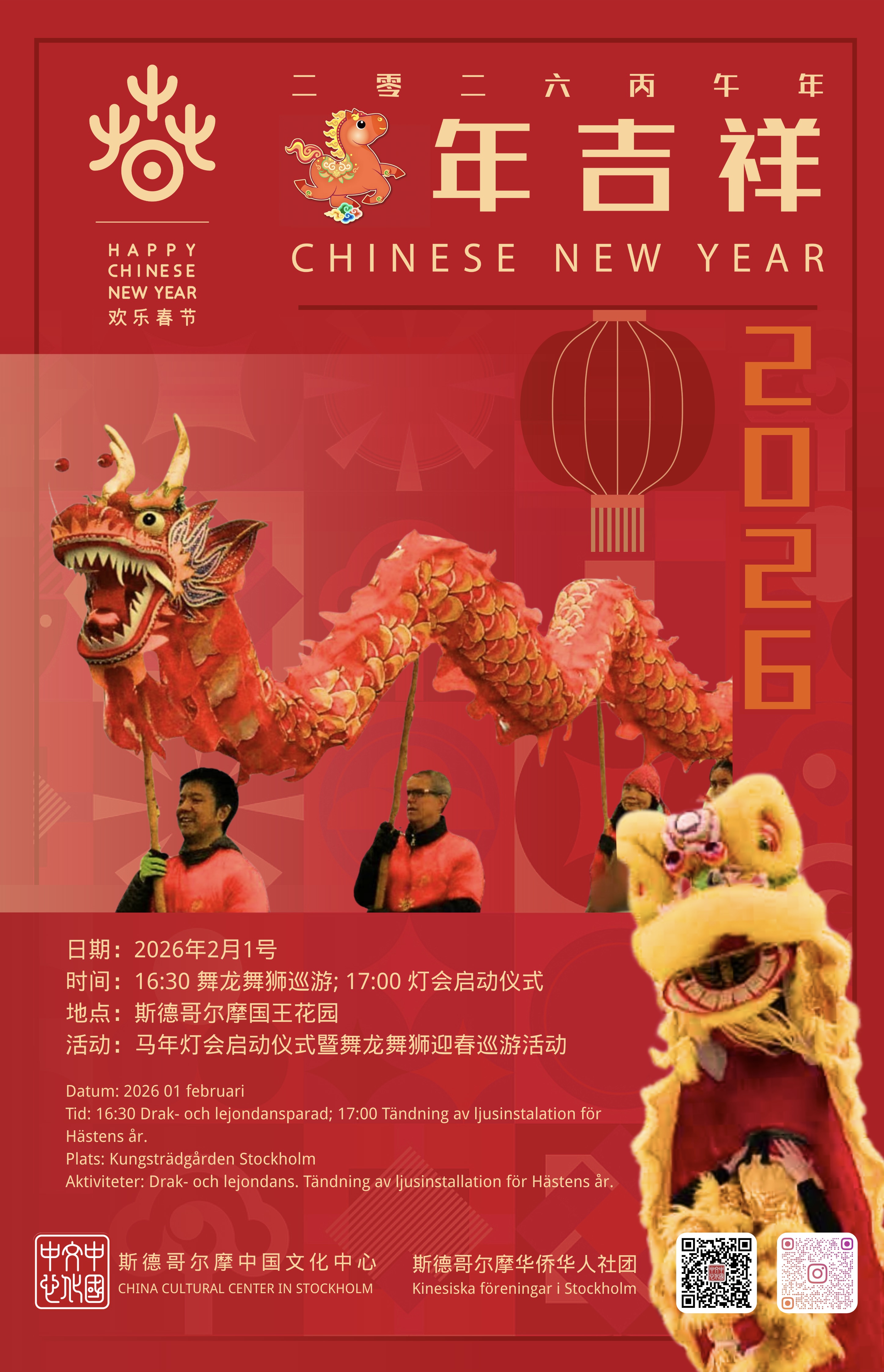 大家好!春节将近,2月1号下午由斯德哥尔摩中国文化中心和斯德哥尔摩侨社共同举办春节活动。届时有马年灯会启动仪式和舞龙舞狮以及广场联欢节目。