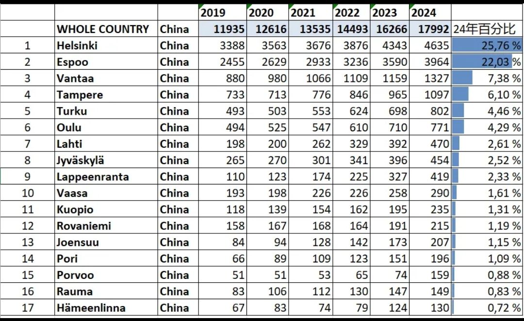 根据Statistics Finland(https://stat.fi/en)的统计数据,截至2024年12月31号,在芬兰的中国人有17992人,大部分人集中在赫尔辛基大区,还有图尔库,坦佩雷等地;人数最多前十的城市居住80%左右的中国人。