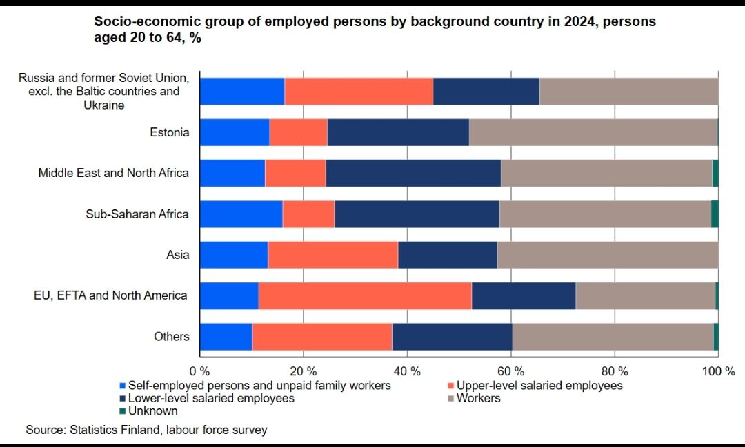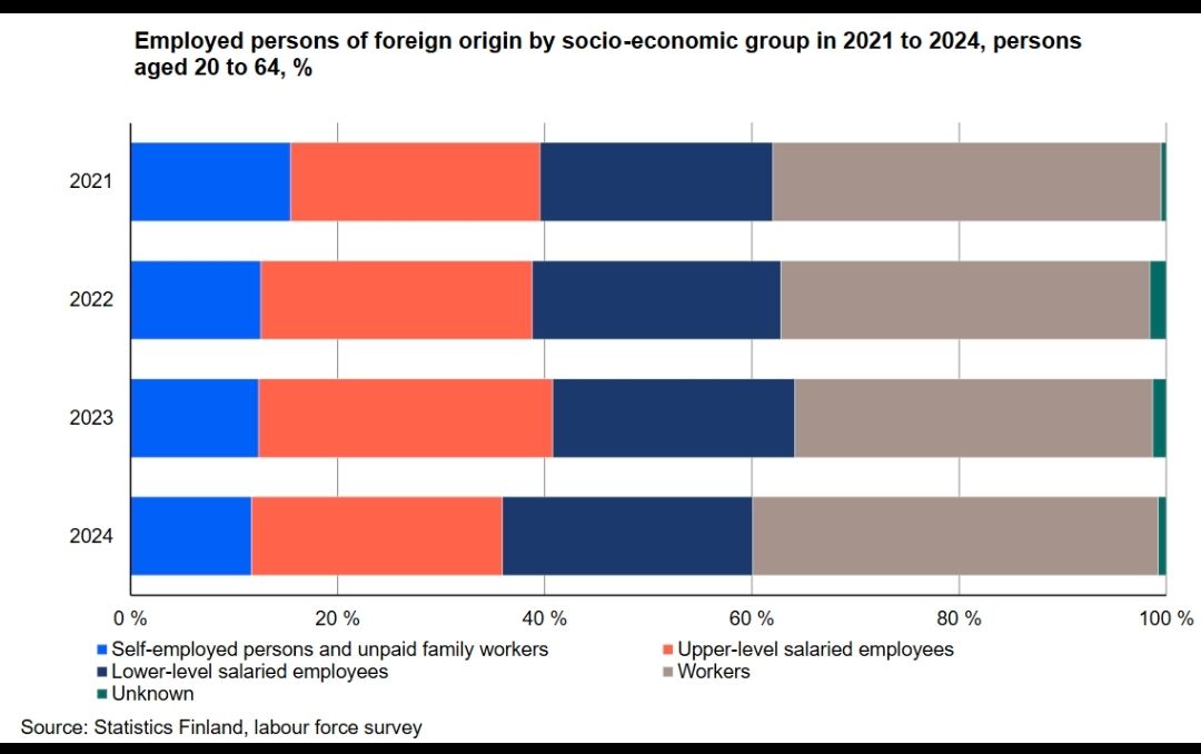截至2024年,芬兰全部移民占芬兰全国人口的11%,如果针对20-64岁工作人口的话移民占12%(According to the statistics on population structure,11per cent of the entire Finnish population and12per cent of the20to64age group were of foreign origin in2024.)关于从事的行业,没找到只针对华人的统计,但是有针对移民和亚洲的统计:(统计分类的翻译也许不准确)