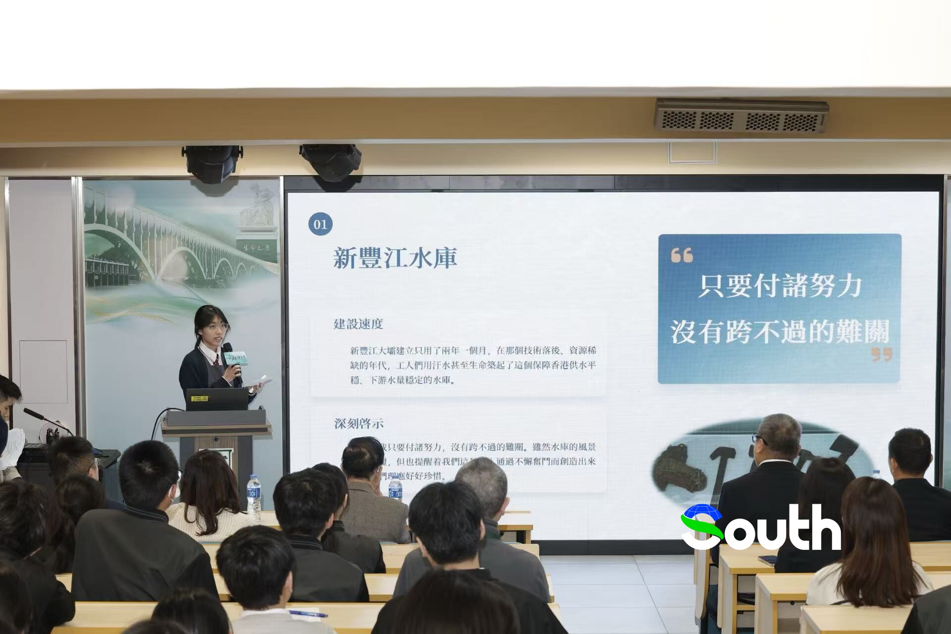 培僑中學學生盧弈在故事荟上分享了自己的走訪心得。她表示,從新豐江水電站到金湖泵站,再到船灣淡水湖,一路走來,她結識了眾多默默堅守的水利工作者。這些工作者扎根崗位、無私奉獻,為保障香港用水安全傾盡心力,他們身上的敬業精神與奉獻品格,為香港青少年樹立了榜樣,值得大家認真學習。