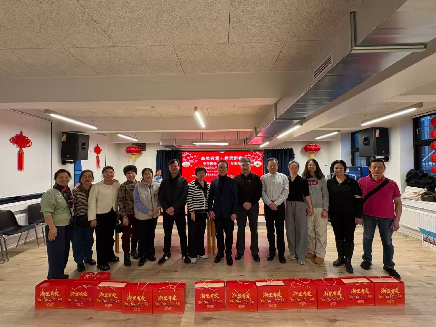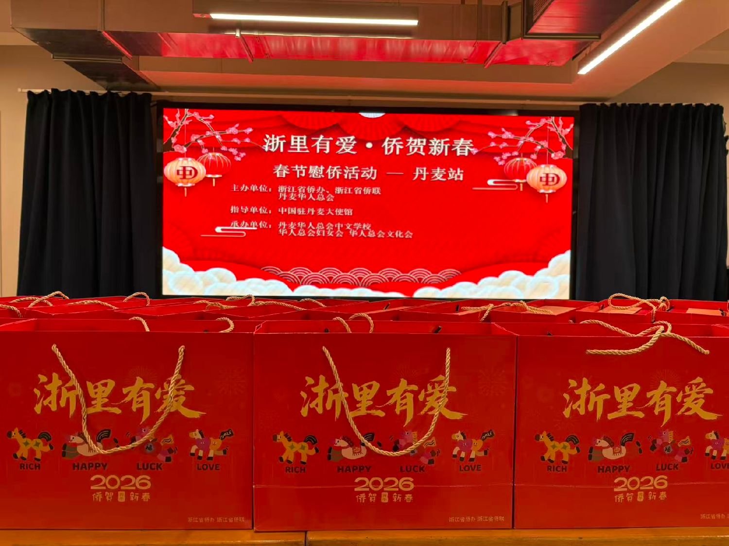 1月24日,腊月初六星期六,丹麦华人总会的会所热气腾腾,热火朝天,喜气洋洋。大银幕上大红背景,“浙里有爱侨贺新春”几个大字分外鲜艳夺目。舞台前整整齐齐地摆放着“浙里有爱”的大礼盒。