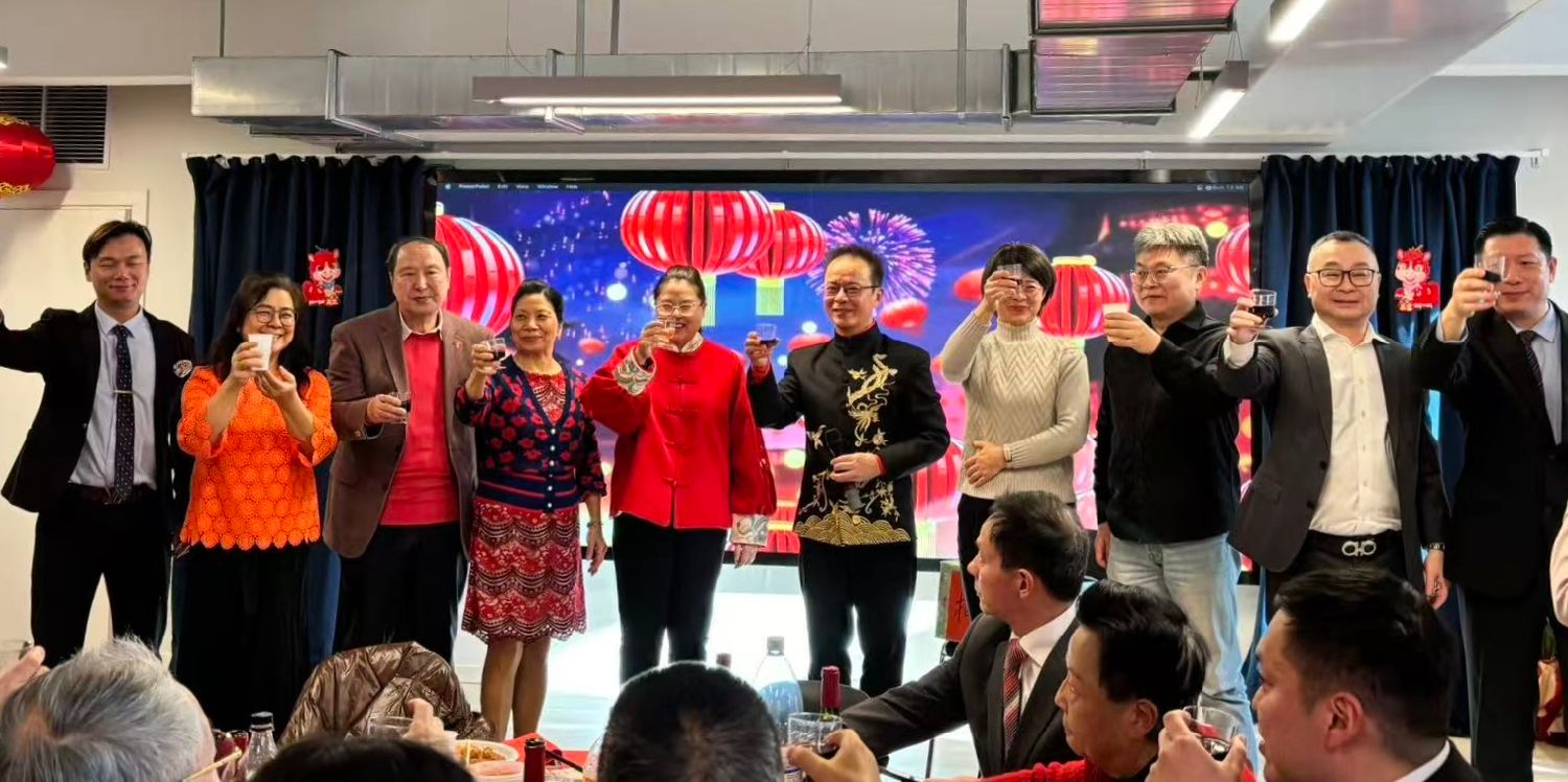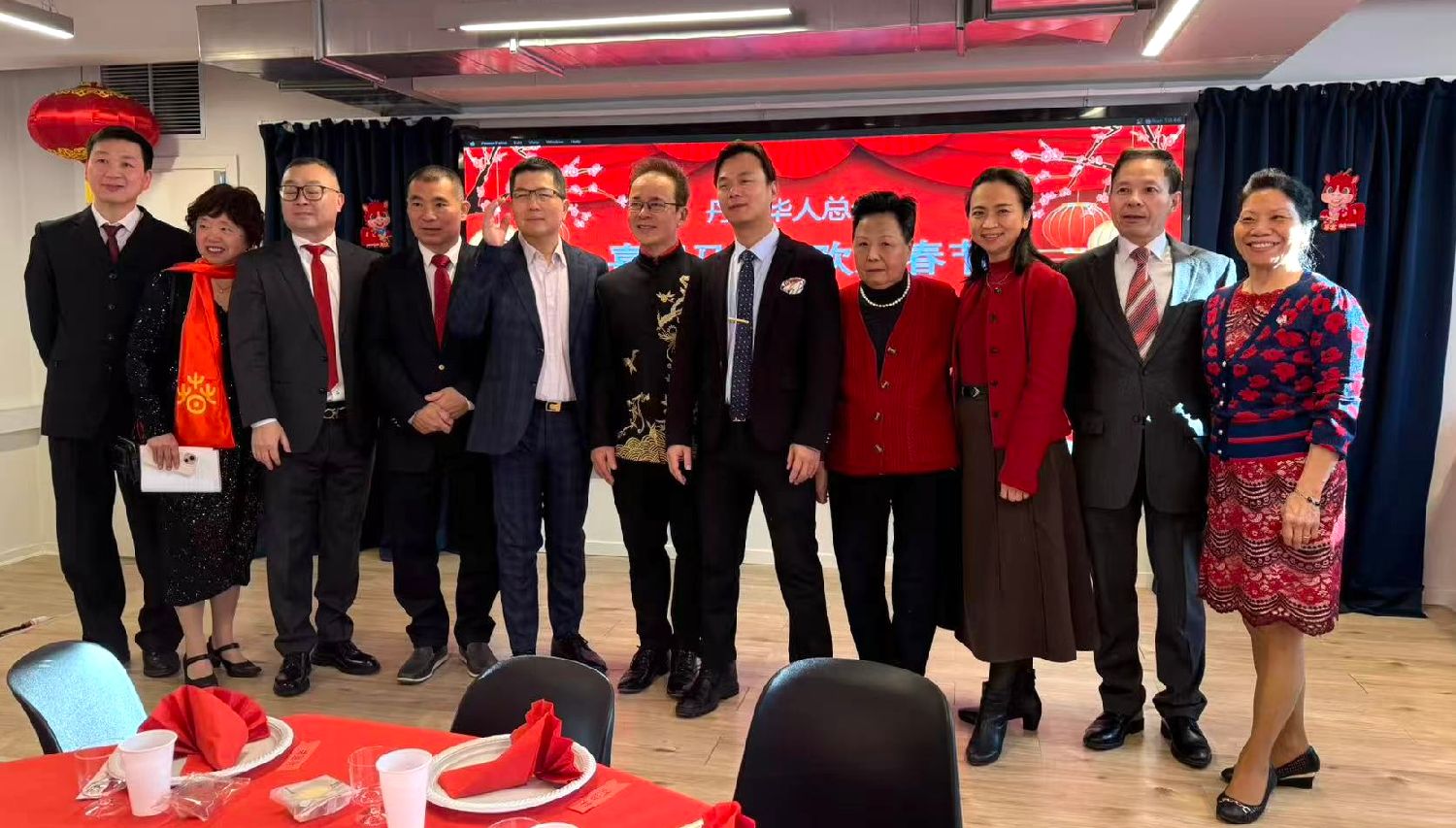 总会的主席、副主席、部分常委、使官的官员等上台举起酒杯,向大家敬酒,共祝:马年吉祥,马到成功!
