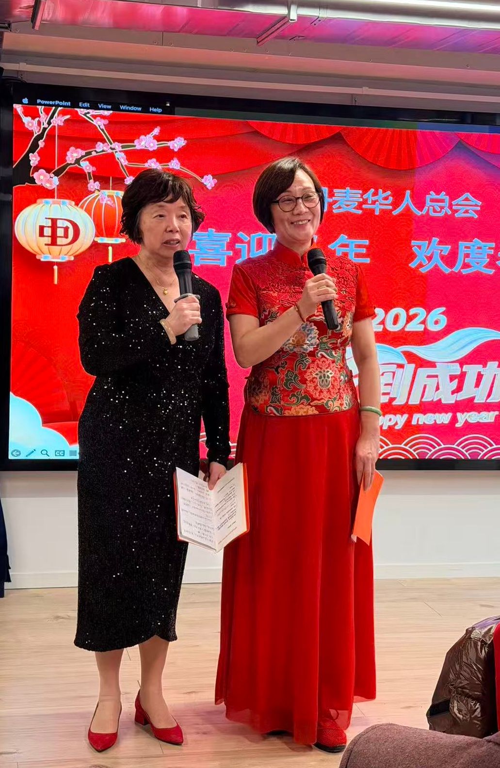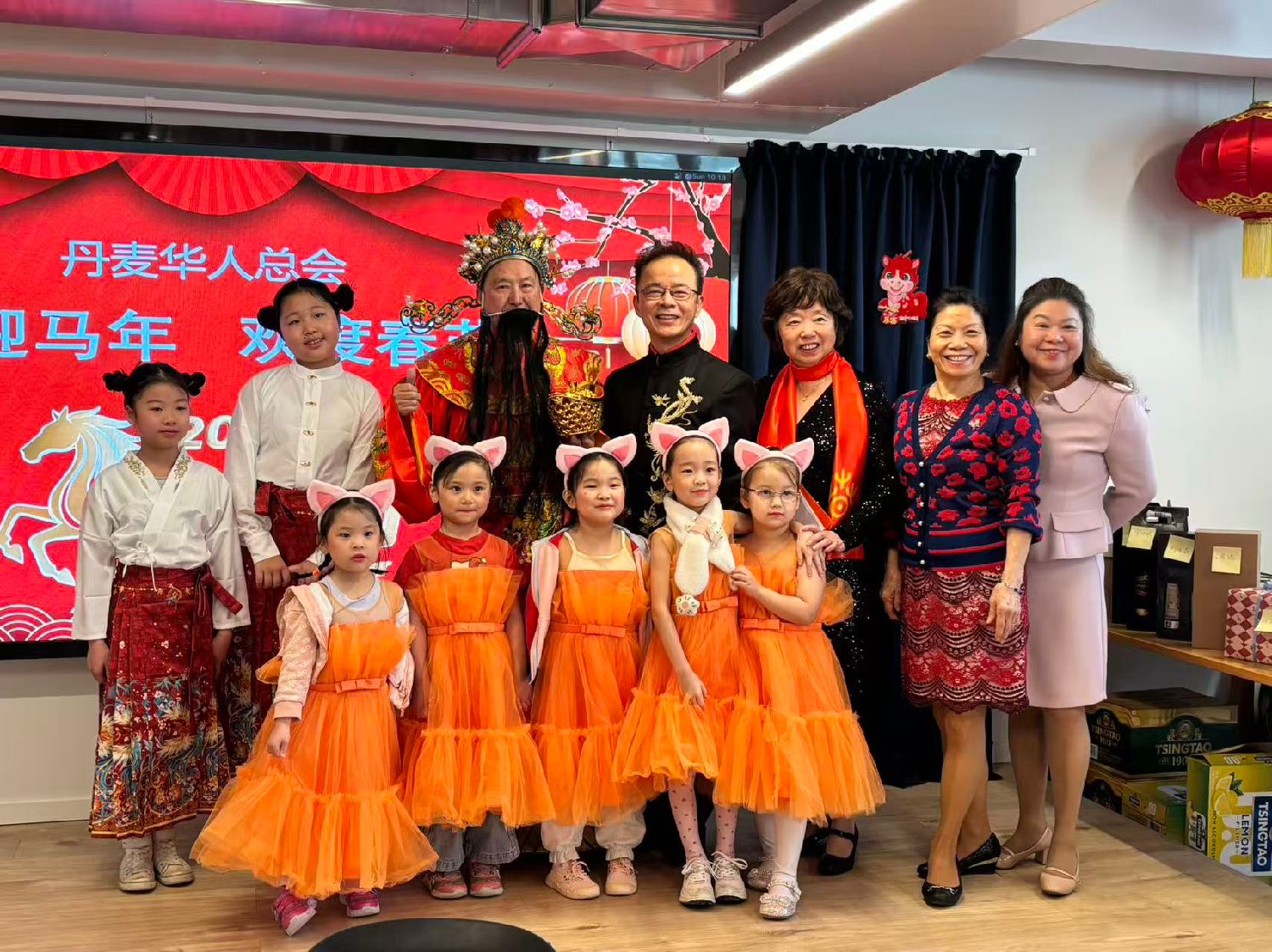 总会首席副主席柯本佑扮演的财神、妇女会会长叶康云、常委陈安妮一起在门口迎宾。11:00身着红与黑礼服的司仪俞露和磨红玲在喜庆的音乐声中步向舞台,宣布:丹麦华人总会《2026年马年春节联欢会》现在开始!并介绍了参加联欢会的主要嘉宾:中国驻丹麦大使馆苏丽雅代办、沈昂主任、张帆领事、哥本哈根中国文化中心慕享宏主任,东航哥本哈根于燕燕经理以及各社团的领导和代表。老老少少、欢聚一堂。在司仪们“拜年了!”的声音中,拉开了联欢会帷幕。