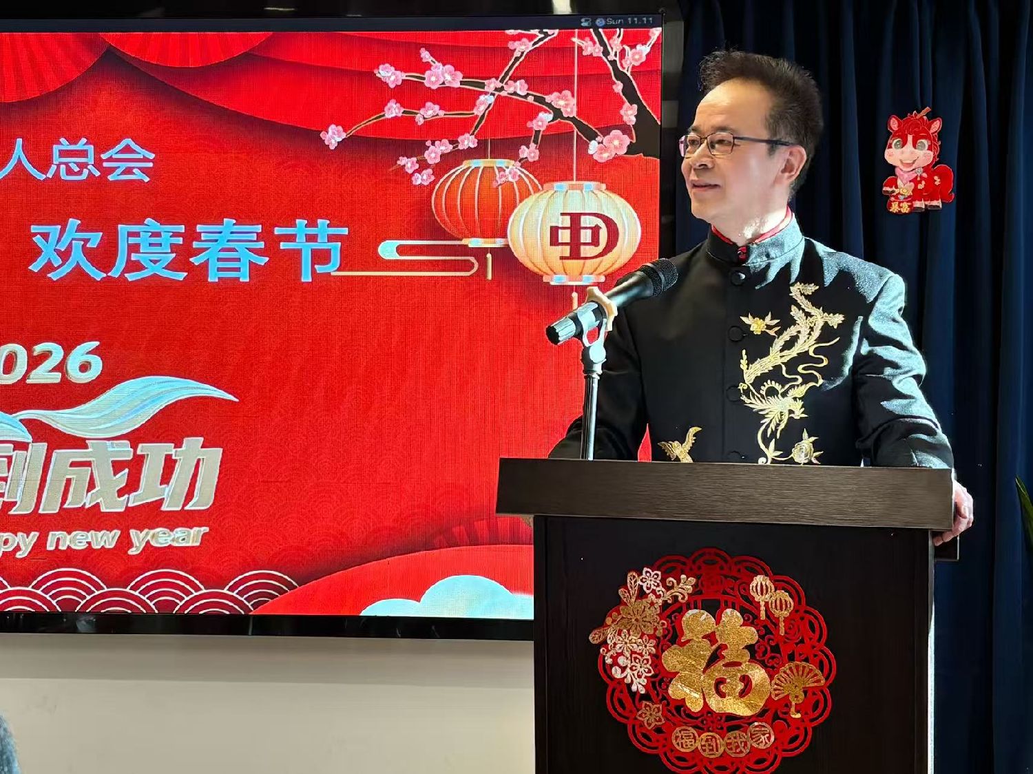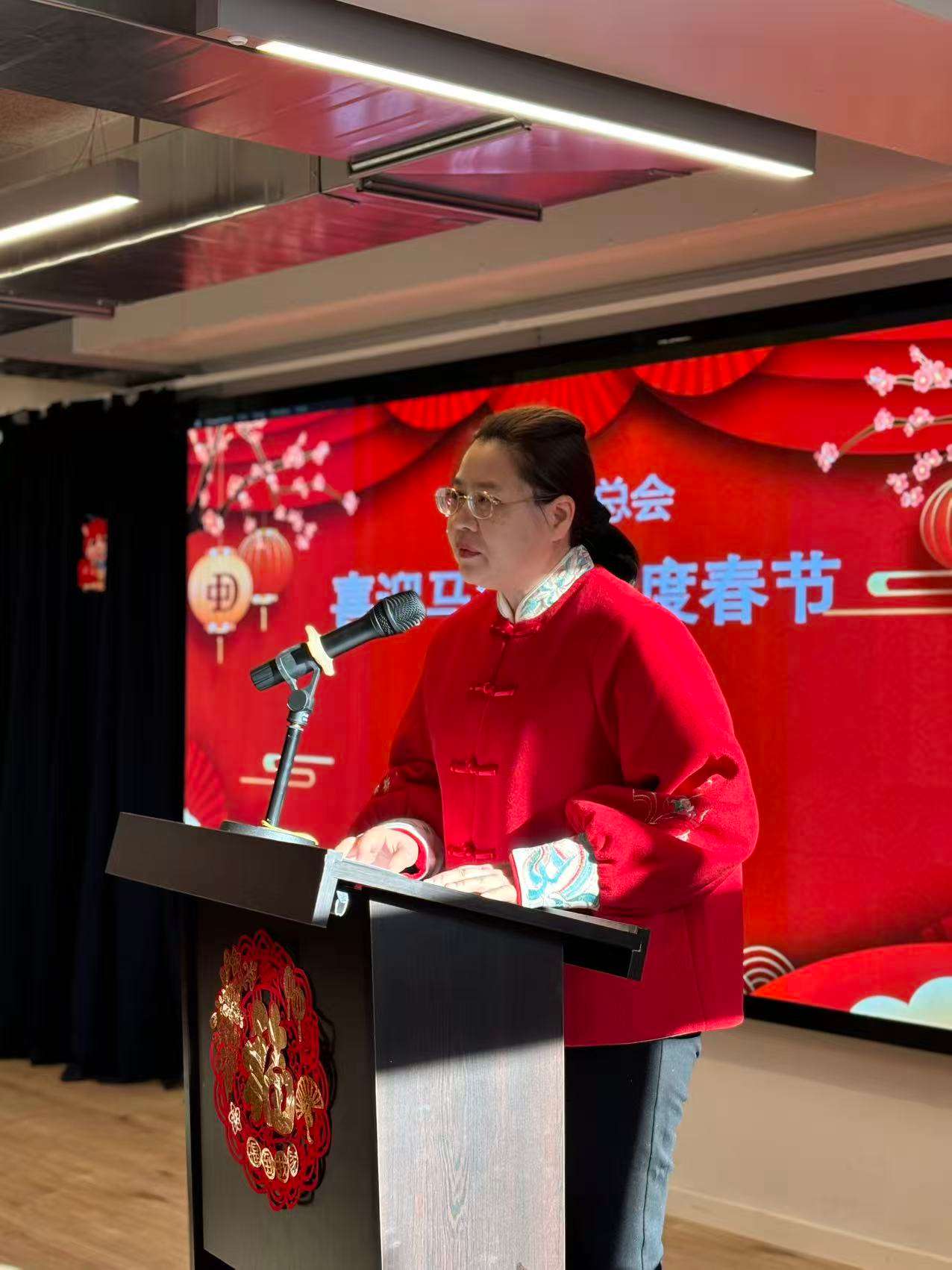 接下来由中国驻丹麦大使馆苏丽雅代办致辞。她激动地说道:“在这辞旧迎新、喜庆祥和的美好时刻,我们欢聚一堂,共庆中华民族的传统佳节—一春节。在此,我谨代表中国驻丹麦大使馆,向所有在丹华侨华人、中国同胞,致以最热烈的新春问候和最诚挚的美好祝福!也向长期以来关心支持祖国发展、积极推动中丹友人表示衷心的感谢!”“春节,是刻在每一位中华儿女血脉里的文化根脉,承载着阖家团圆的温情、辞旧迎新的喜悦,更寄托着对国泰民安、风调雨顺的祈愿。即便远隔山海,这份对故土的眷恋、对传统的坚守,始终是我们共同的精神纽带。”她𣈱谈了祖国的发展与进步,赞扬了海外华侨华人的爱国热情和奉献。苏代办亲切、和蔼的话语,如一股暖流温暖着我们每个华人华侨的心田。大家报以热烈的掌声以示感谢,感谢使馆对华人华侨的支持与关爱。感谢来自祖国的情和爱。