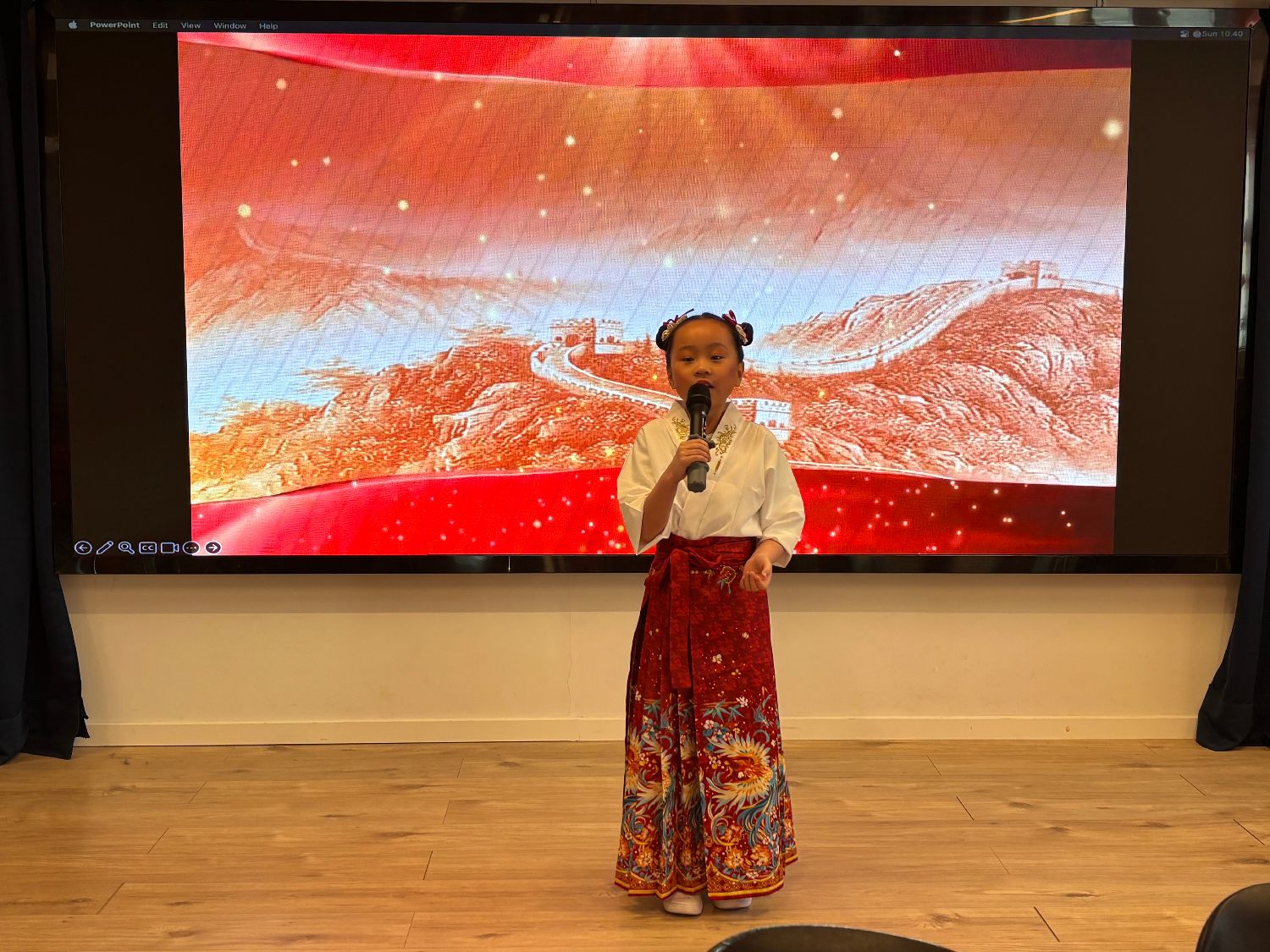 七岁小女孩方蓁演唱的“我和我的祖国”,把活动推向了一个新的高潮,她歌声悠扬,吐字清晰,满怀激情。感动了在场的每位观众,大家情不自禁地也哼了起来。台上台下融为一体,寄托了对祖国的深情厚意。