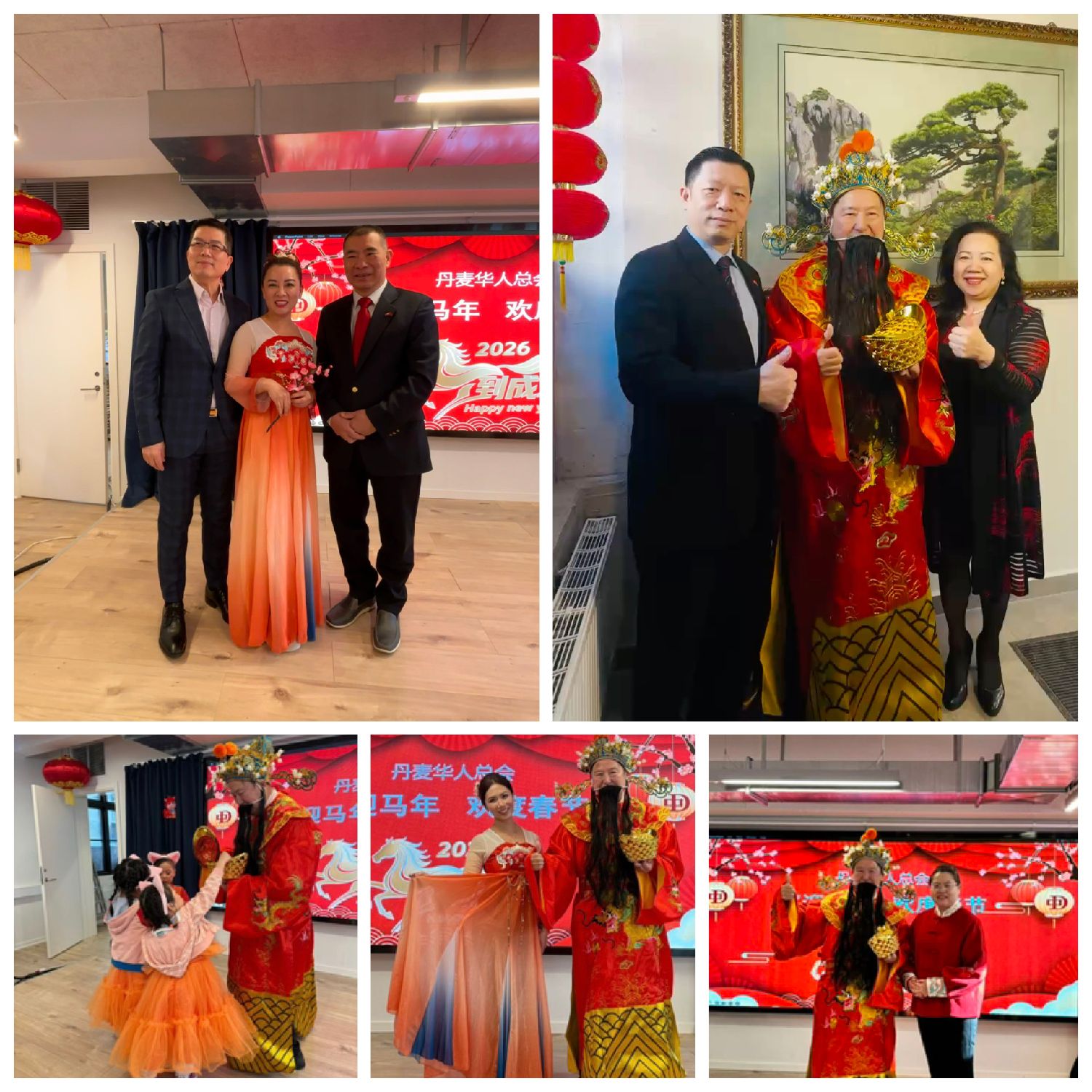 金蛇辞旧岁,骏马迎新春。2026年2月15日雪后初霁,今天终于着到了久违的太阳,冰雪在阳光的照射下熠熠发光。走进丹麦华人总会会所,火火红红,热气腾腾。红色的灯笼、红色的如意结、红色的“福”字,在墙上高高悬挂,灵动的龙在屋梁上游动。“春节序曲”的音乐在空中迴旋。舞台大银幕上“丹麦华人总会喜迎新春欢度马年”几个大字和骏马飞腾的画面鲜艳夺目。十二张大圆桌,犹如十二朵盛开的大红花。会场充满着浓郁的年味。“财神”和总会领导在门口迎宾。处处洋溢着喜庆和祥和。