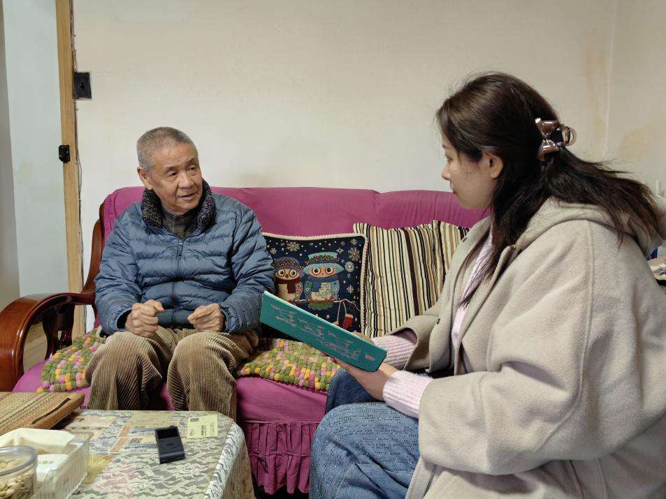 近日,侨眷王弘毅在上海市普陀区的家中与新侨范卓然(右)讲述家族往事。(图片来源:中新社)