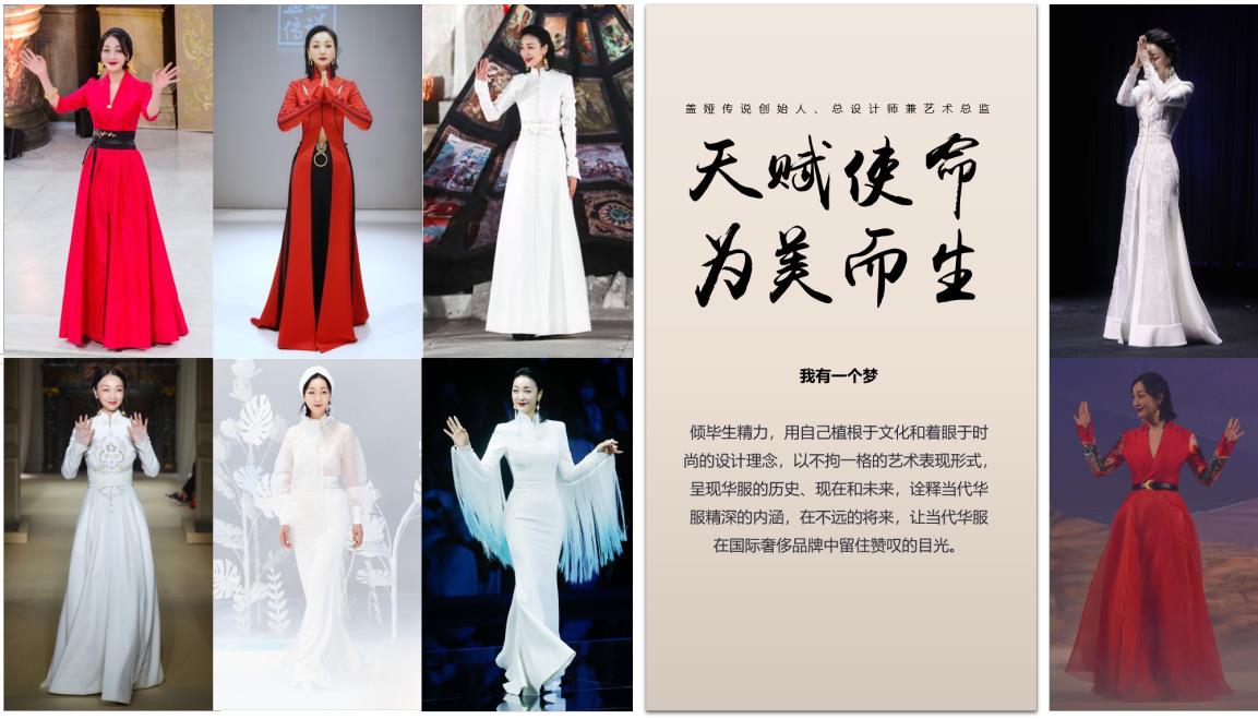 熊英认为服装是最浓缩的文化表达方式,在东方哲学影响西方之前,是东方的审美和服装在影响着西方。把服装作为文化的第一面、作为时代的汇报、文化的引领,这种认识高度,也许是盖娅传说能如此打动各方人士的本质原因。众多明星为其走秀,也曾参加央视热门时尚节目《衣尚中国》的录制,展示敦煌文化风韵,展现国风和合之美。更是受邀参加2021年央视春晚的邀约,在时隔39年后,将时装秀演结合科技再登春晚。