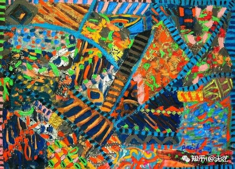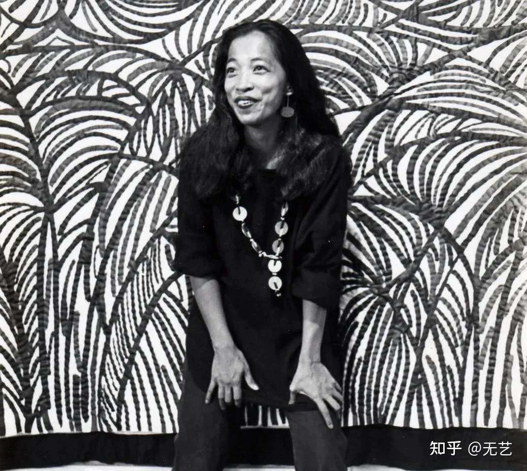 她在广泛研究课题的同时,还运用色彩绚丽的波浪状的圆和点,有时还用线、针、耳饰等加强了作品的复杂性,强调作品的美学。