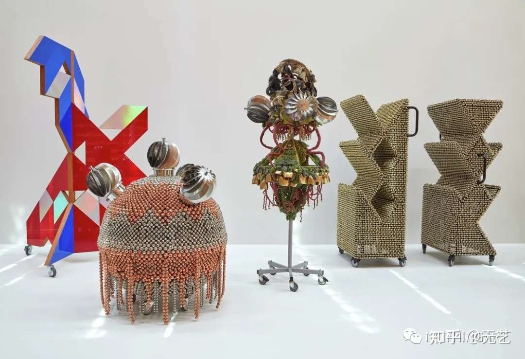 在她职业生涯的最后20年里,她一直在她的三维“龙舌兰”绘画中探索抽象。这些雕塑彩绘作品包括手工缝制的布料和装饰品,融合了传统图案、布料、贝壳、纽扣和镜子。