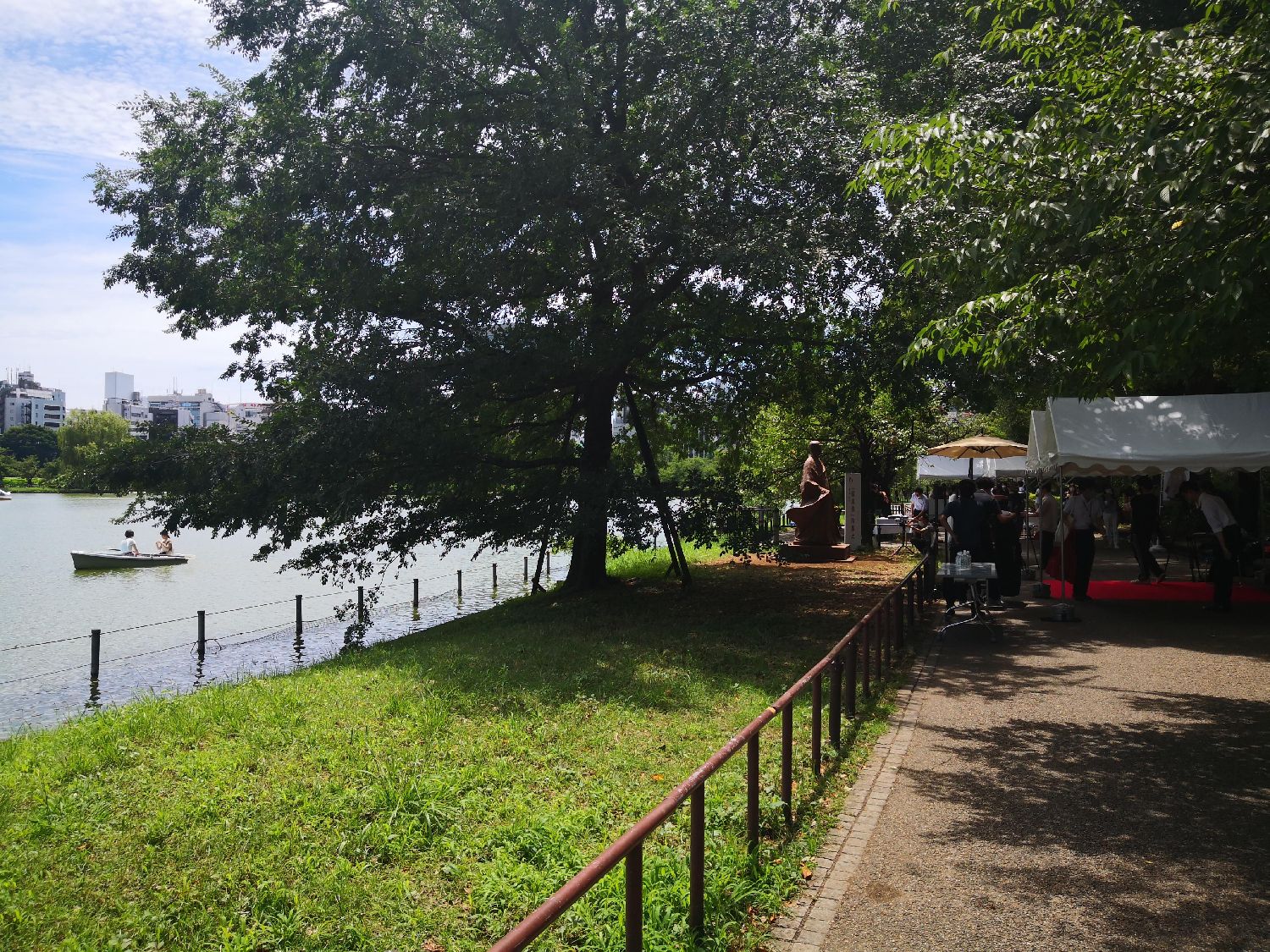 中国驻日本大使孔铉佑、东京都知事小池百合子女士、日本外务大臣政务官三宅伸吾等中日嘉宾共同为《鉴真铜像》揭幕。铜像将永立于风光秀美的上野恩赐公园不忍池畔,供游客和民众参观瞻仰。