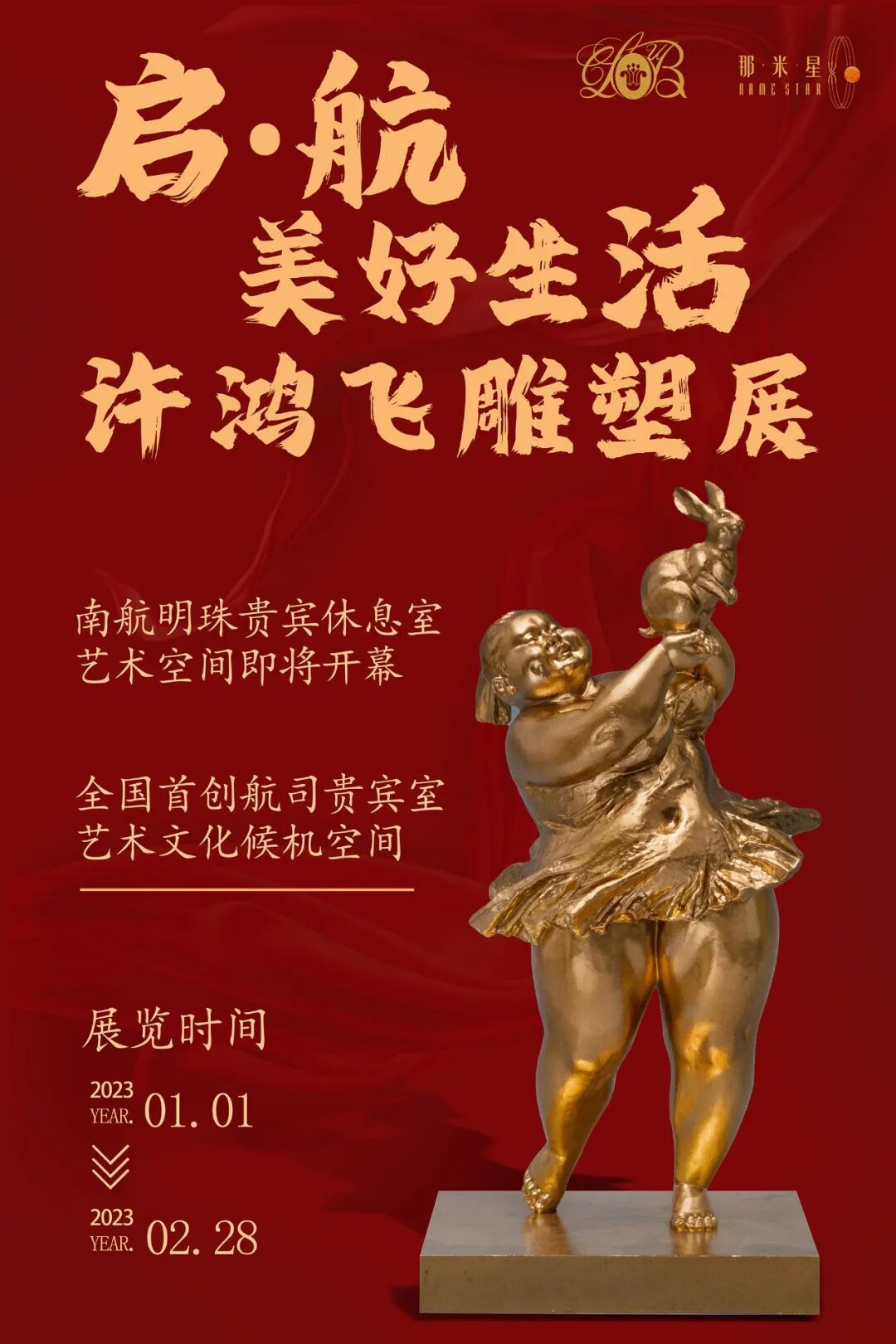 2023年1月1日“启航·美好生活”许鸿飞雕塑艺术展将在全国首创航司休息室候机艺术空间——中国南方航空明珠广州休息室艺术空间开幕!