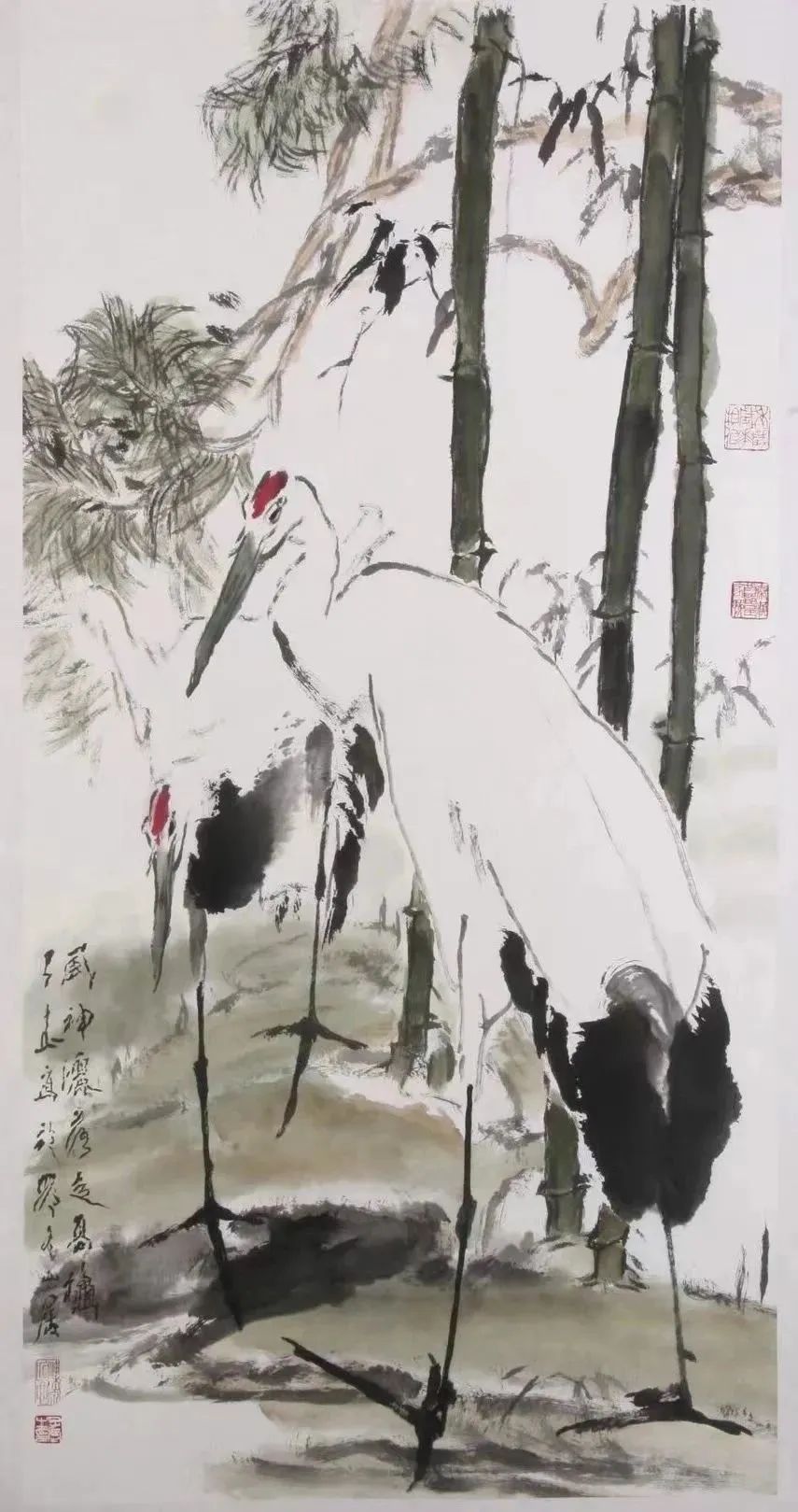 仙鹤是王子武钟爱的动物题材。《风神洒落占高秋》是王子武晚年画仙鹤喜欢使用的画作名称。“羽翼光明欺积雪,风神洒落占高秋。”出自唐代郑谷的诗《鹤》,形容仙鹤高洁,寄托了诗人高逸潇洒的情怀。