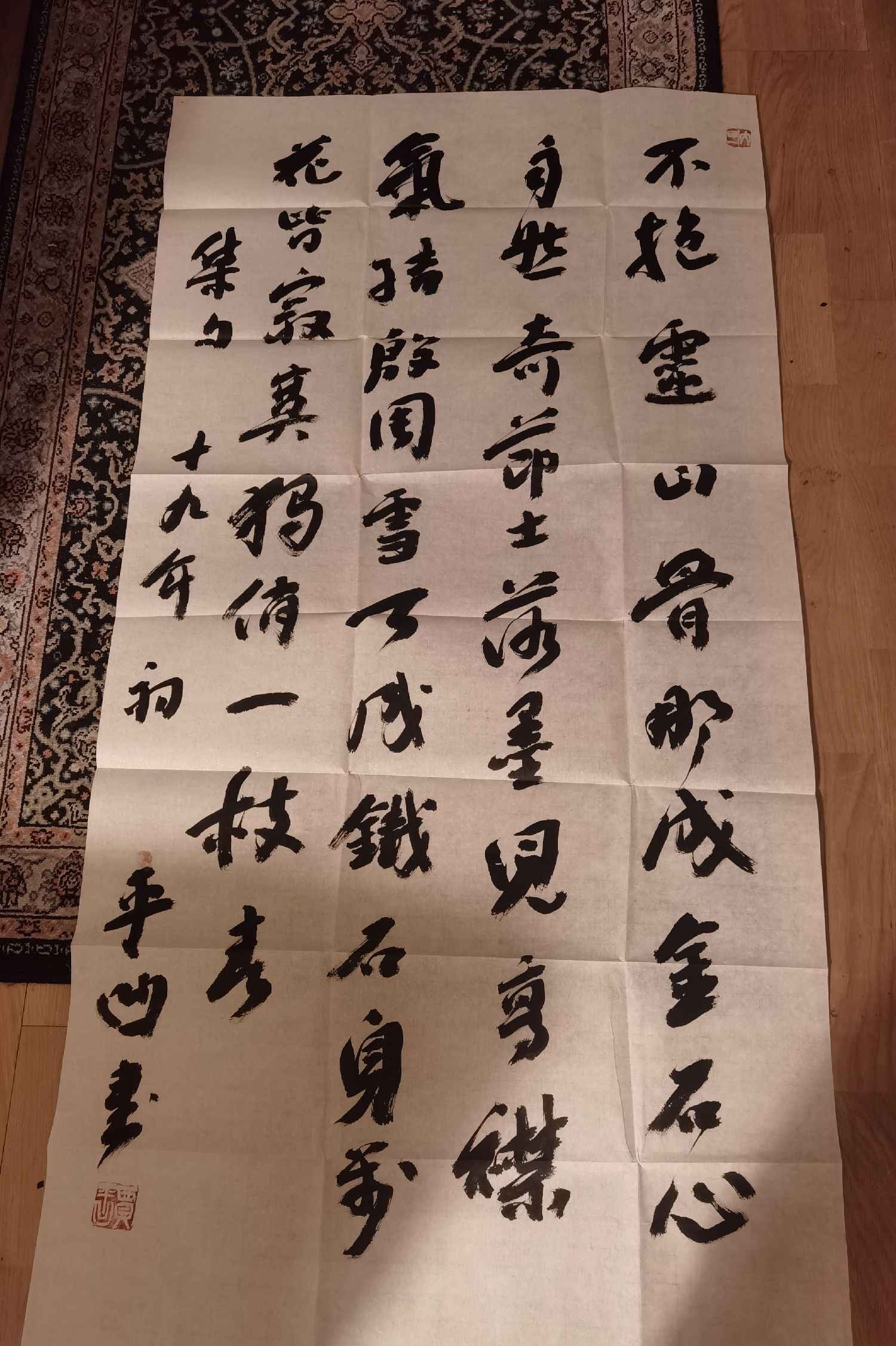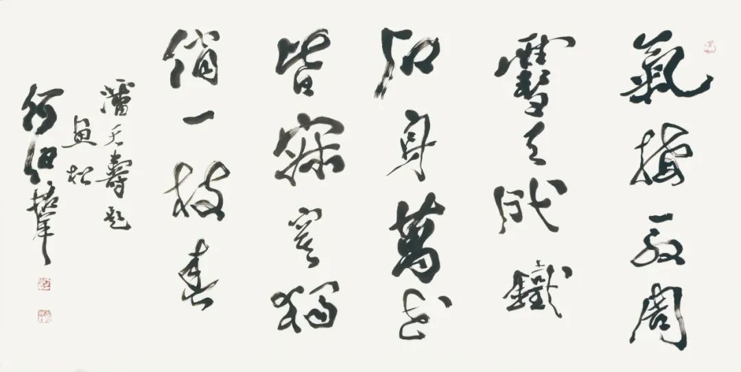 怀着对潘天寿先生的崇敬,对潘先生这首诗作的欣赏,甲午隆冬,何伯群先生于故居梅月堂,望着院中那树凌寒怒放的腊梅来了兴致,于是就于梅月堂的书案之上,一气呵成此幅笔精墨妙、朴拙大气的书作——“气结殷周雪”。