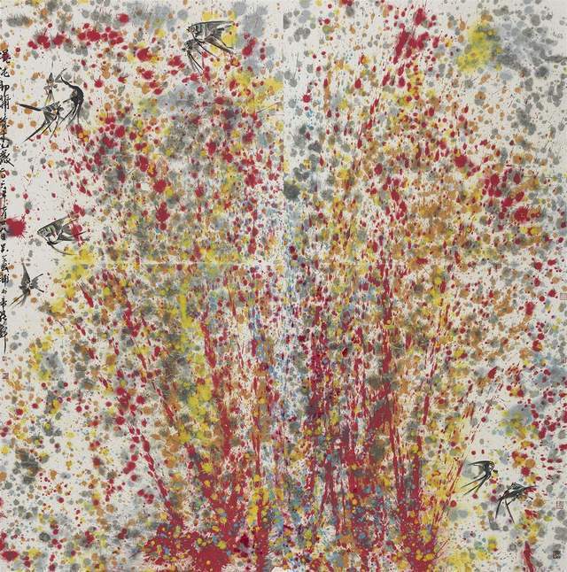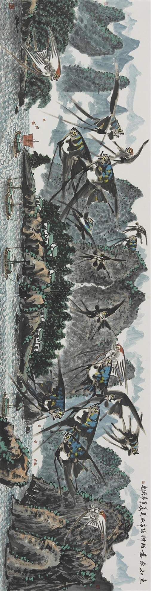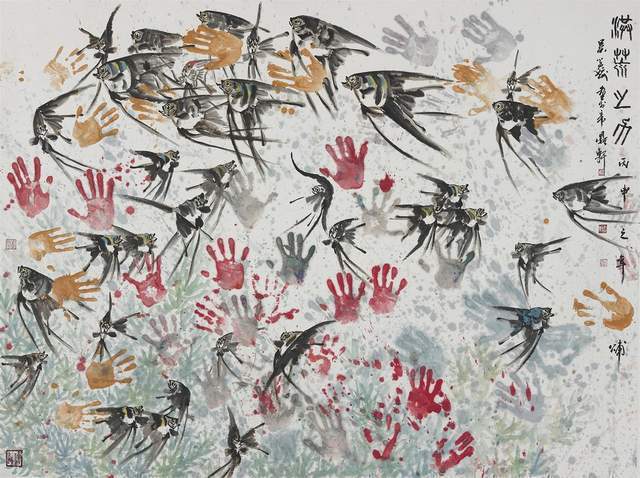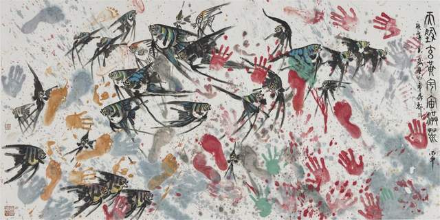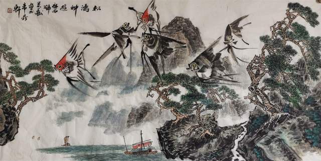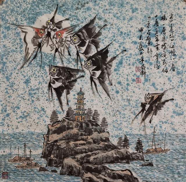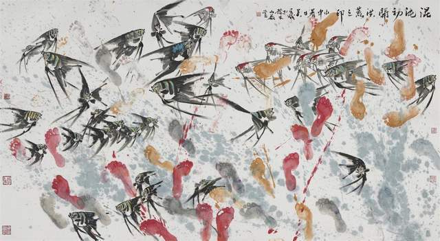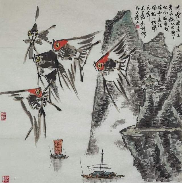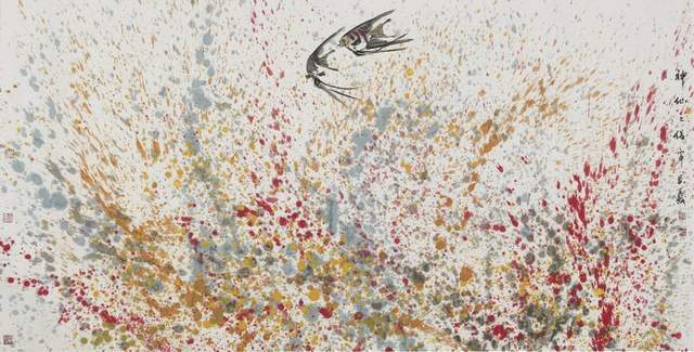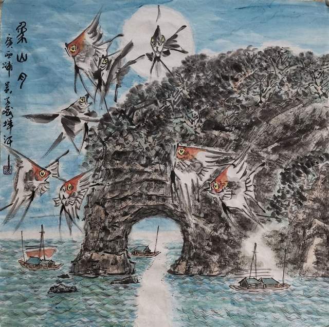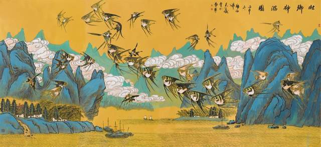 中国画是讲究规矩的,按部就班画常理,就应该是树在山里,鱼在水里,鸟肯定飞在天上。但吴学斌的鱼可以游到山间,可以飞在天上,可以穿梭在林中。这是不合常理的一种超客观现象,但他又是符合主观个情理现象。俨然是脱离了绘画构图中羁绊,“大胆妄为”地试图开辟岀一套“学斌构图法”来!