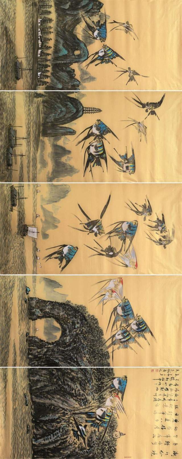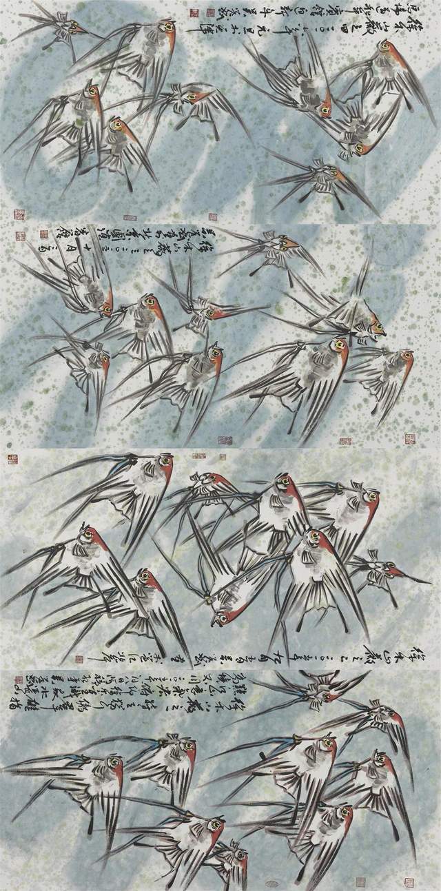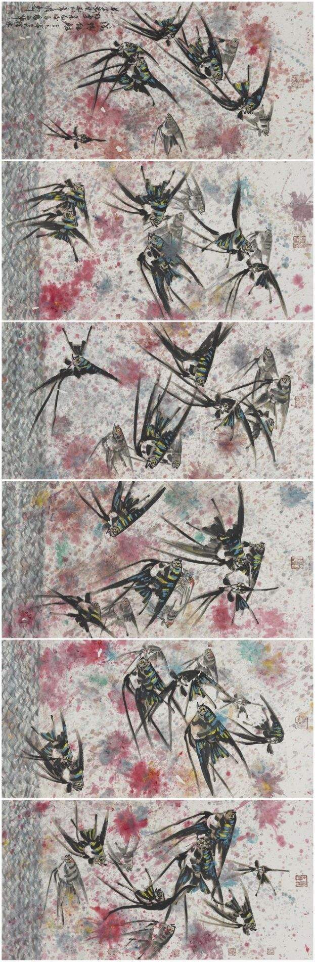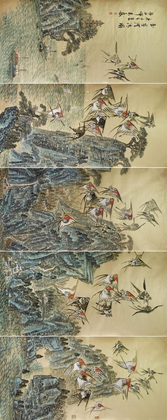 中国画是讲究规矩的,按部就班画常理,就应该是树在山里,鱼在水里,鸟肯定飞在天上。但吴学斌的鱼可以游到山间,可以飞在天上,可以穿梭在林中。这是不合常理的一种超客观现象,但他又是符合主观个情理现象。俨然是脱离了绘画构图中羁绊,“大胆妄为”地试图开辟岀一套“学斌构图法”来!