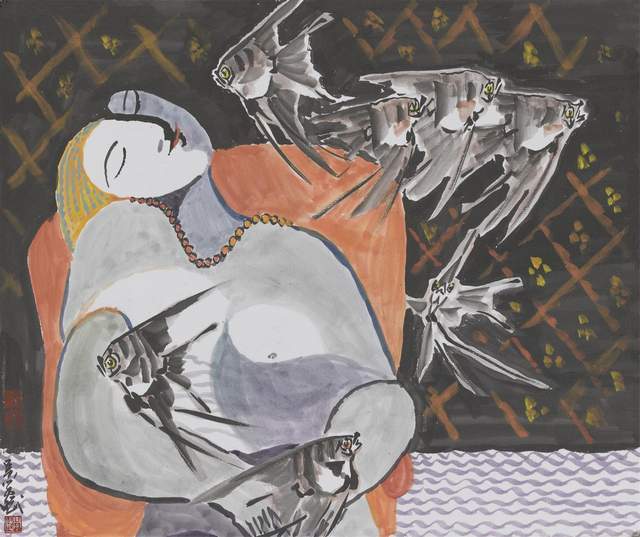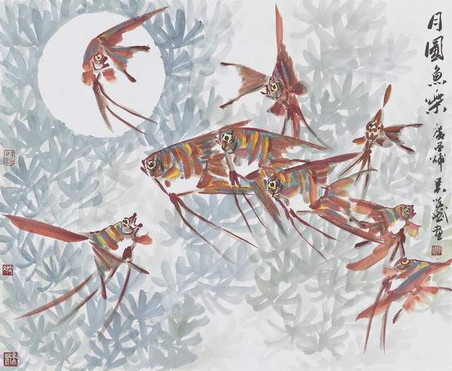 《月圆鱼乐》45x55cm法国前总理拉法兰收藏