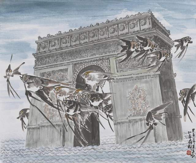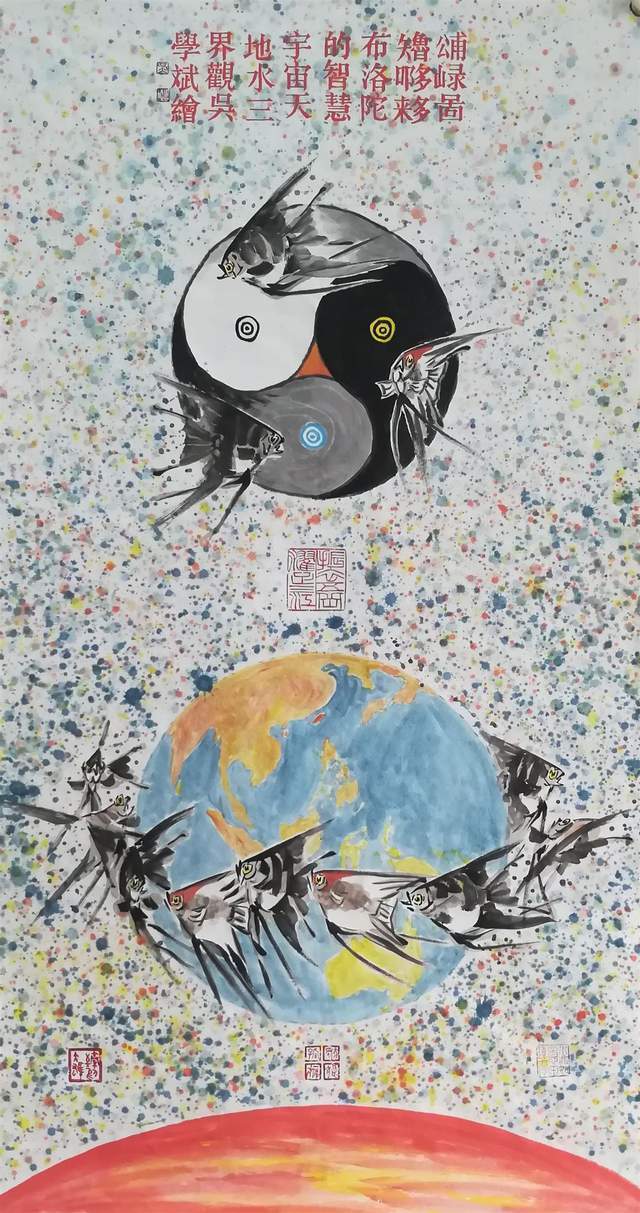 我们中国画画鱼,在鱼的后边没有画任何背景的时候,那就是留白。这个留白肯定是水,不是江河就是大海。但他把背景物象画上去了,这就令人匪夷所思了。现实中这个鱼是不能在山上游,也不能在天上游,也不能在土地上游的,但是他画的是他心里的画,他情感里的画。我们看他的情感世界是多么的广阔,多么的深远,多么的宏大。所以,凡大艺术家他的独具慧眼都是和常人不一样的,而吴学斌先生则具备了不一样的大家天赋。
