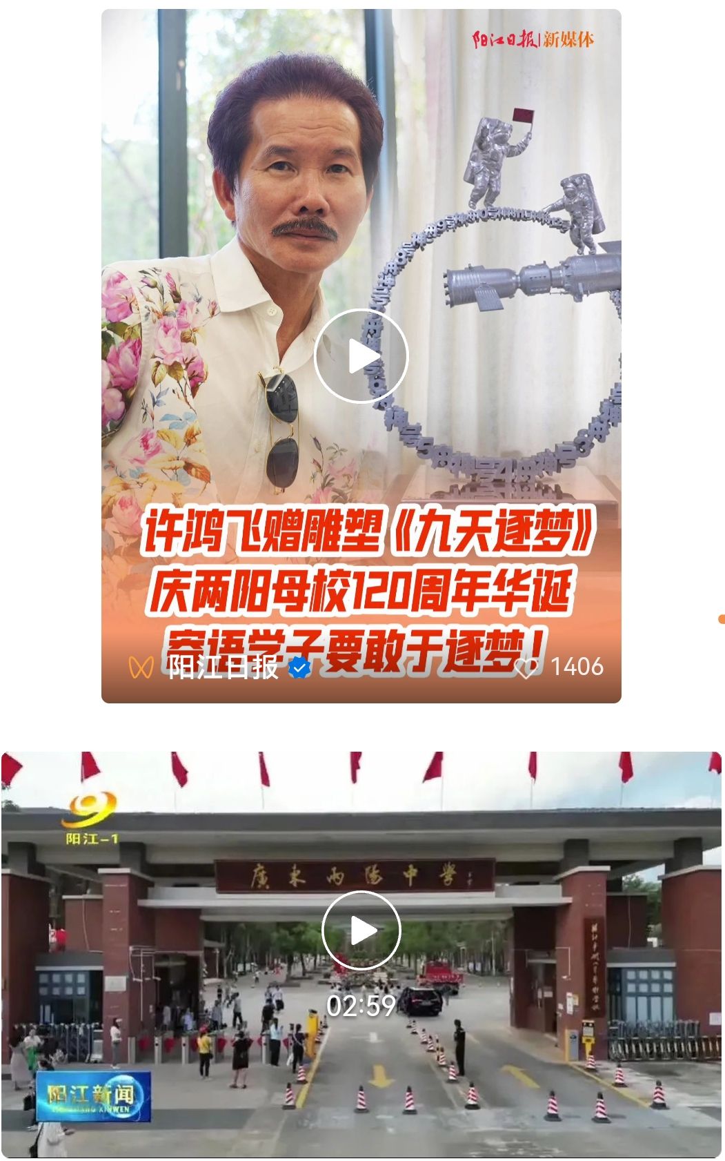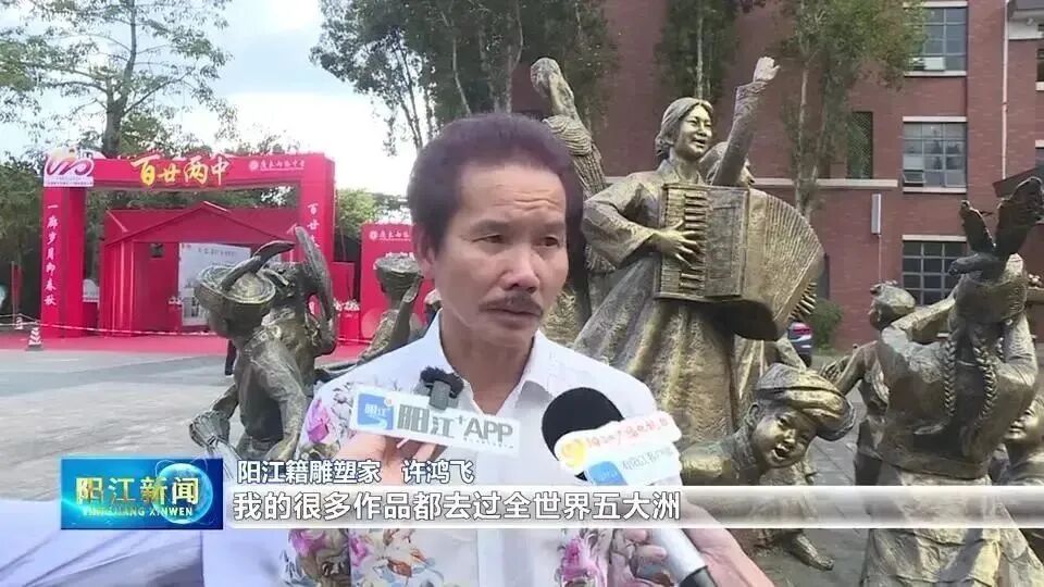 阳江籍雕塑家许鸿飞:我的很多作品都去过全世界五大洲,一下子回到两阳中学有另外一种效果,加上喜庆的作品比较多。这次就把《九天逐梦》送给学校留在这里,学校也是梦想开始的地方,很多东西都是通过这里实现的,《九天逐梦》还是比较适合学校的,在学校读书梦想开始也是在学校,这个是比较有意义的。