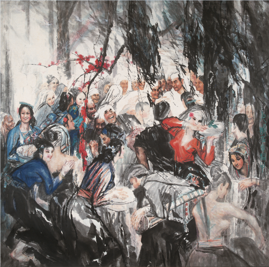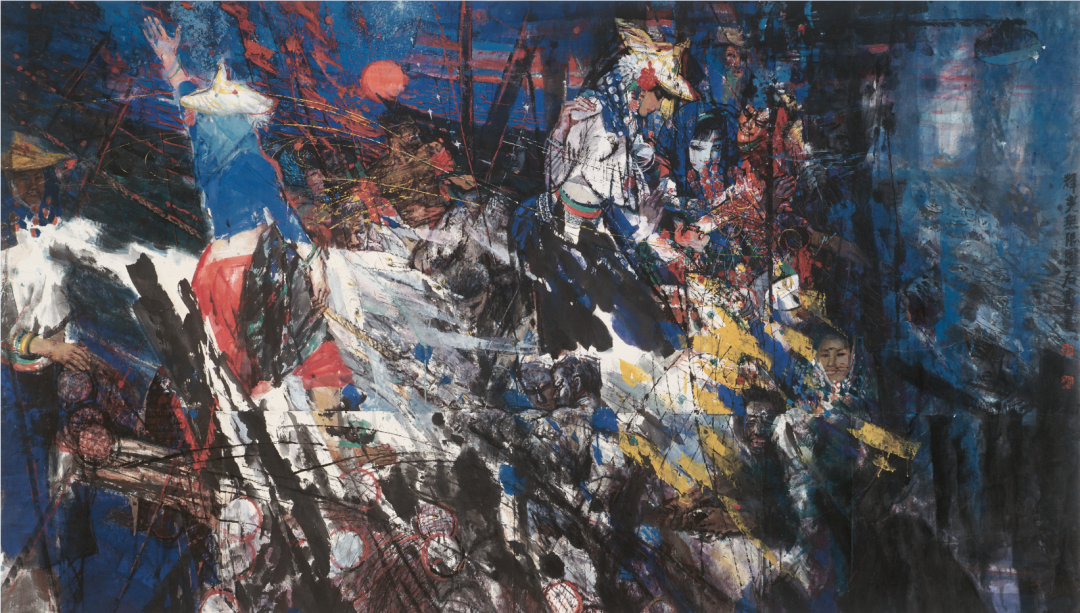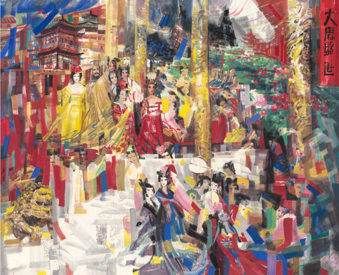 图:石齐作品《大唐盛世》创新的道路永无止境,但万变不离其宗的是中国画的传统。说到自己的绘画,石齐称:“我每画一张画都会想这个事——不要离开中国画。如果按我的手头的技法,离开中国画很容易。可是我想要发展中国画、继承中国画,我必须得有个尺度,有个数码,尺度要60%。”如何计算这60%,石齐给出了自己的答案:“去感觉。笔墨、写意、工笔,墨气墨韵,这样去算就能算出来。”那剩下的40%是什么?他认为可以随便发挥。工艺美术、油画、书法、雕塑,一切都可以灵活运用,加上构成、装饰、各个姐妹画种的东西……但要占40%,绝不许多,超过这个比例,中国画的东西就没了。这种创作手法也恰恰是符合“三象合一”本身的艺术追求。